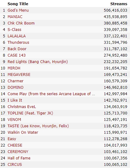🔥 Stray Kids เพลงที่มียอดสตรีมเกิน 100 ล้านครั้งบน Spotify ทั้ง 25 เพลง ดังนี้