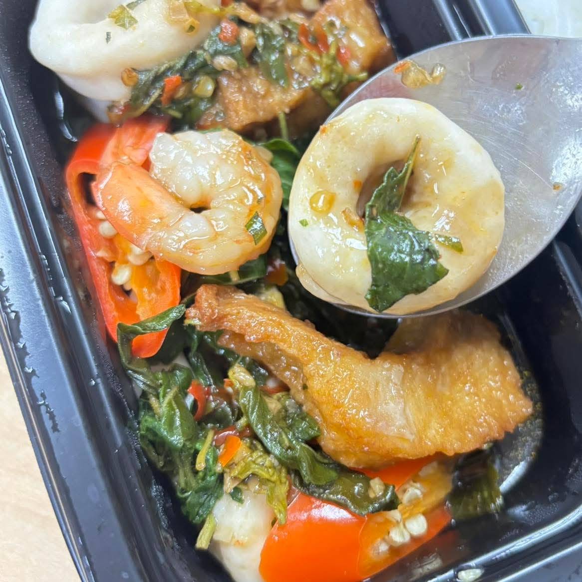 [CR] มีไม่ถึง 100 ก็กินอาหารฝีมือเจ๊ไฝได้ กะเพรารวมมิตรทะเล และปลาทอดกับข้าว
