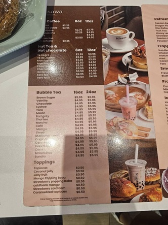 ให้ดูเมนู แล้วจะรู้ว่าที่เราบ่นๆ ว่าของแพง อาหารแพง ขนมแพงคือ ประมาณไหน (อ้อ ชานมไข่มุกสนนราคาแก้วเล็ก 4.95 เหรียญ ตีเป็นเงินไทยในตอนที่ไป 34 บาท ก็ตกที่ราคา 170 บาทต่อแก้ว เพิ่งมาเห็น Thai Tea ตอนที่เขียนนี่แหละ แรกสุดพุ่งไปดูแต่เมนูกาแฟ เล่นเอาอยากรู้เลยว่าจะชงชาไทยออกมาแบบไหน หรือคิดอีกทีอาจจะไม่อยากรู้ก็ได้เพราะไม่คิดว่าจะอร่อยแล้วต้องแลกกับ 170 บาทเปิดประสบการณ์ที่ก็ไม่ได้อยากได้ขนาดนั้น)