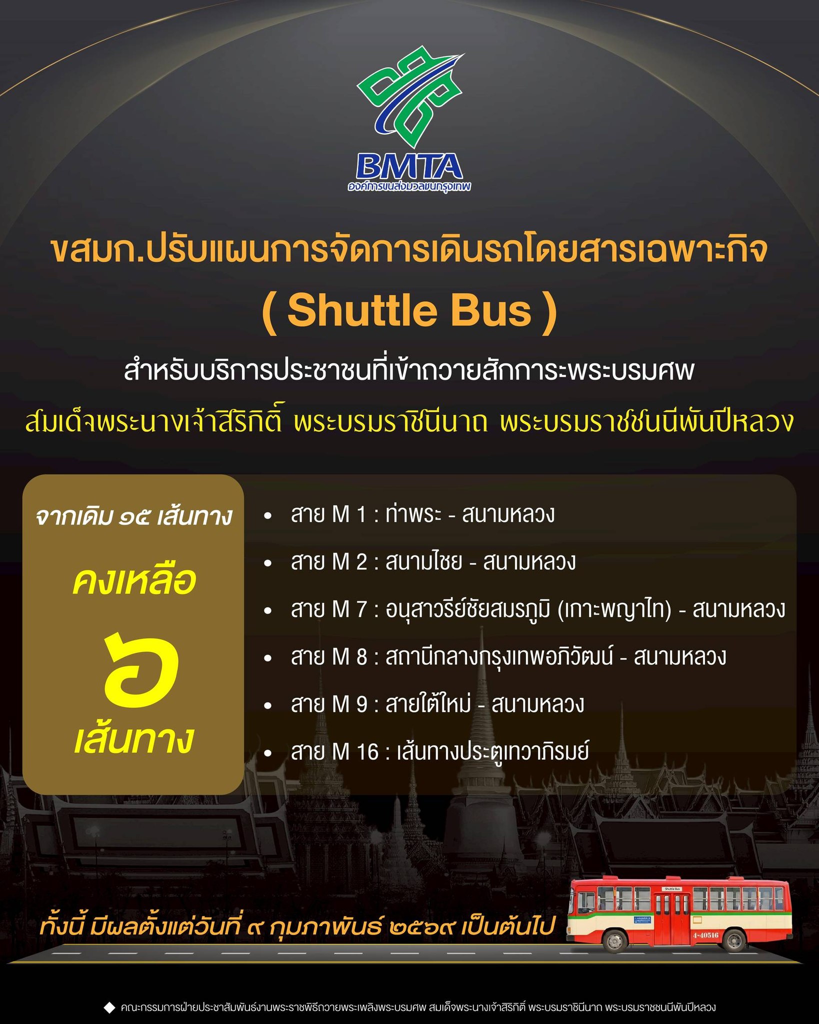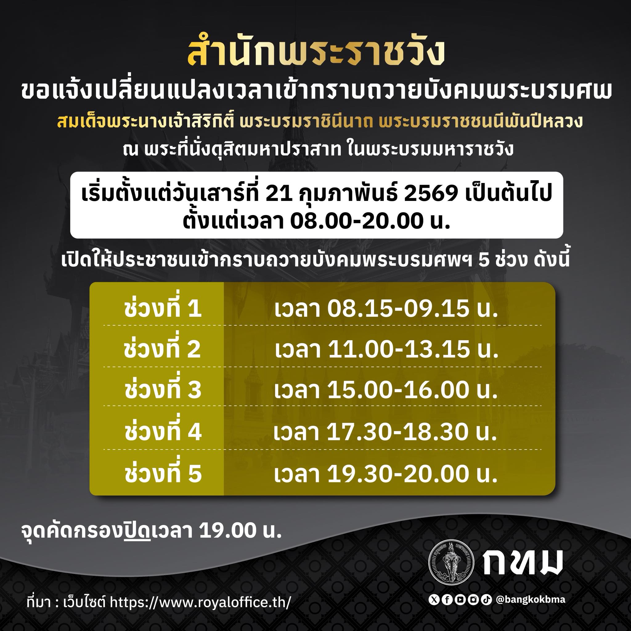 สำนักพระราชวัง ขอแจ้งเปลี่ยนแปลงเวลาเข้ากราบถวายบังคมพระบรมศพ สมเด็จพระนางเจ้าสิริกิติ์ พระบรมราชินีนาถ พระบรมราชชนนีพันปีหลวง ณ พระที่นั่งดุสิตมหาปราสาท ในพระบรมมหาราชวัง และเส้นทางเดินเยี่ยมชม สำหรับนักท่องเที่ยว ตั้งแต่วันเสาร์ที่ ๒๑ กุมภาพันธ์ ๒๕๖๙ เป็นต้นไป