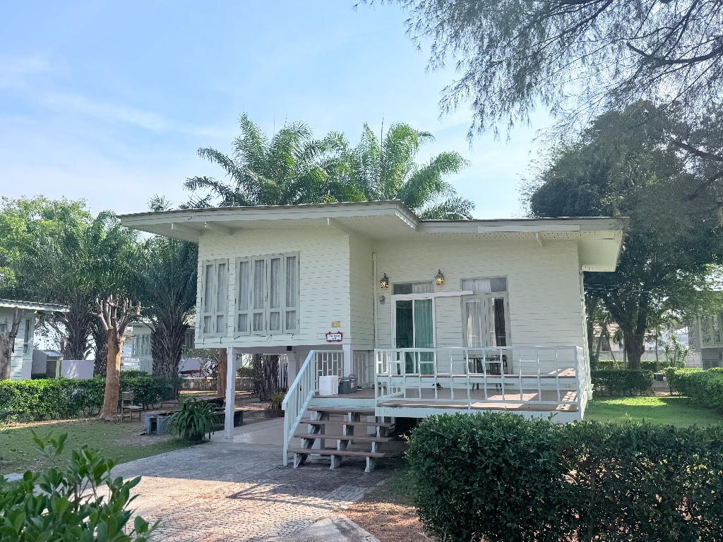 มีสนามหญ้าเขียวๆ บังกะโลสีขาว เงียบสงบดีมาก