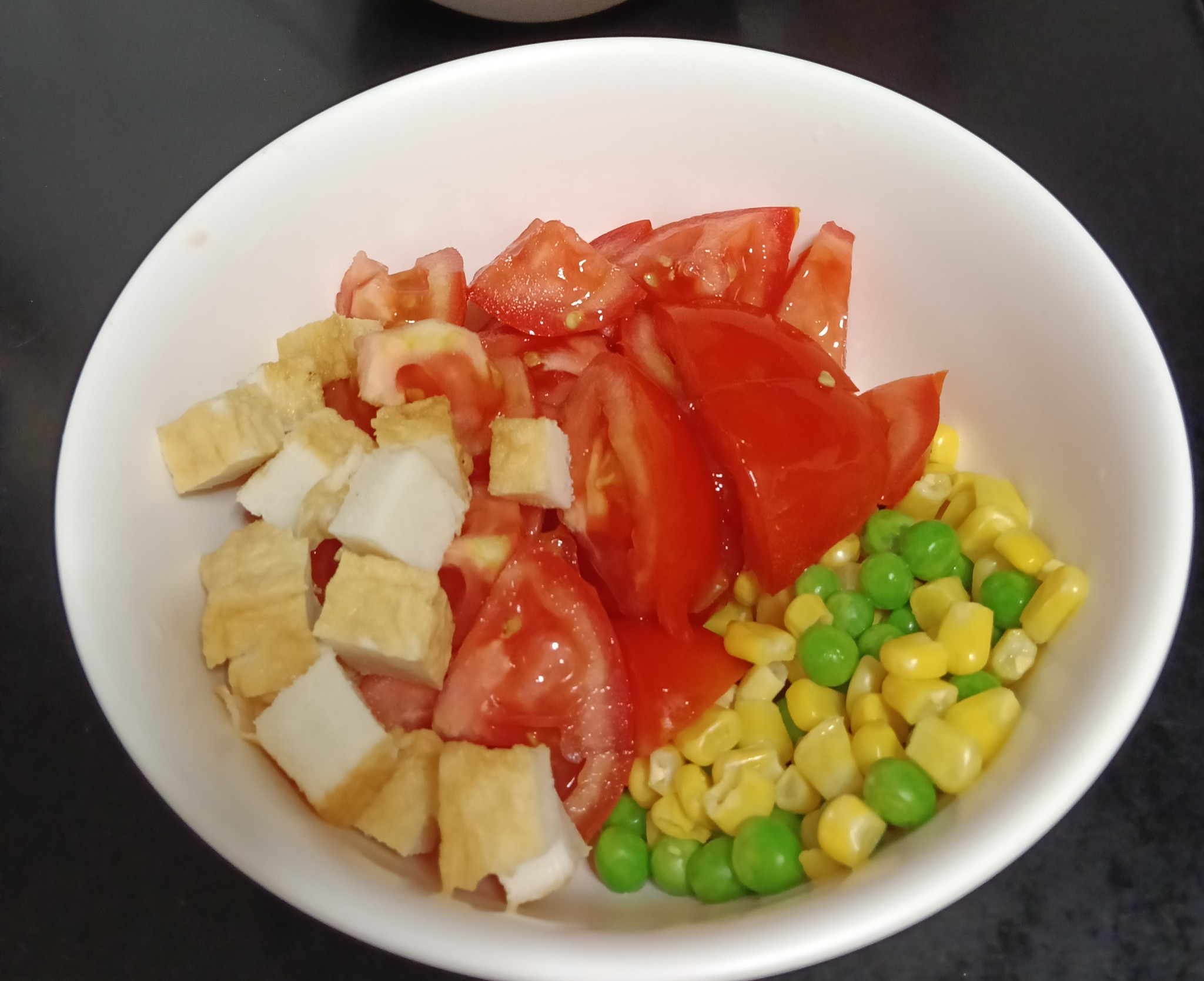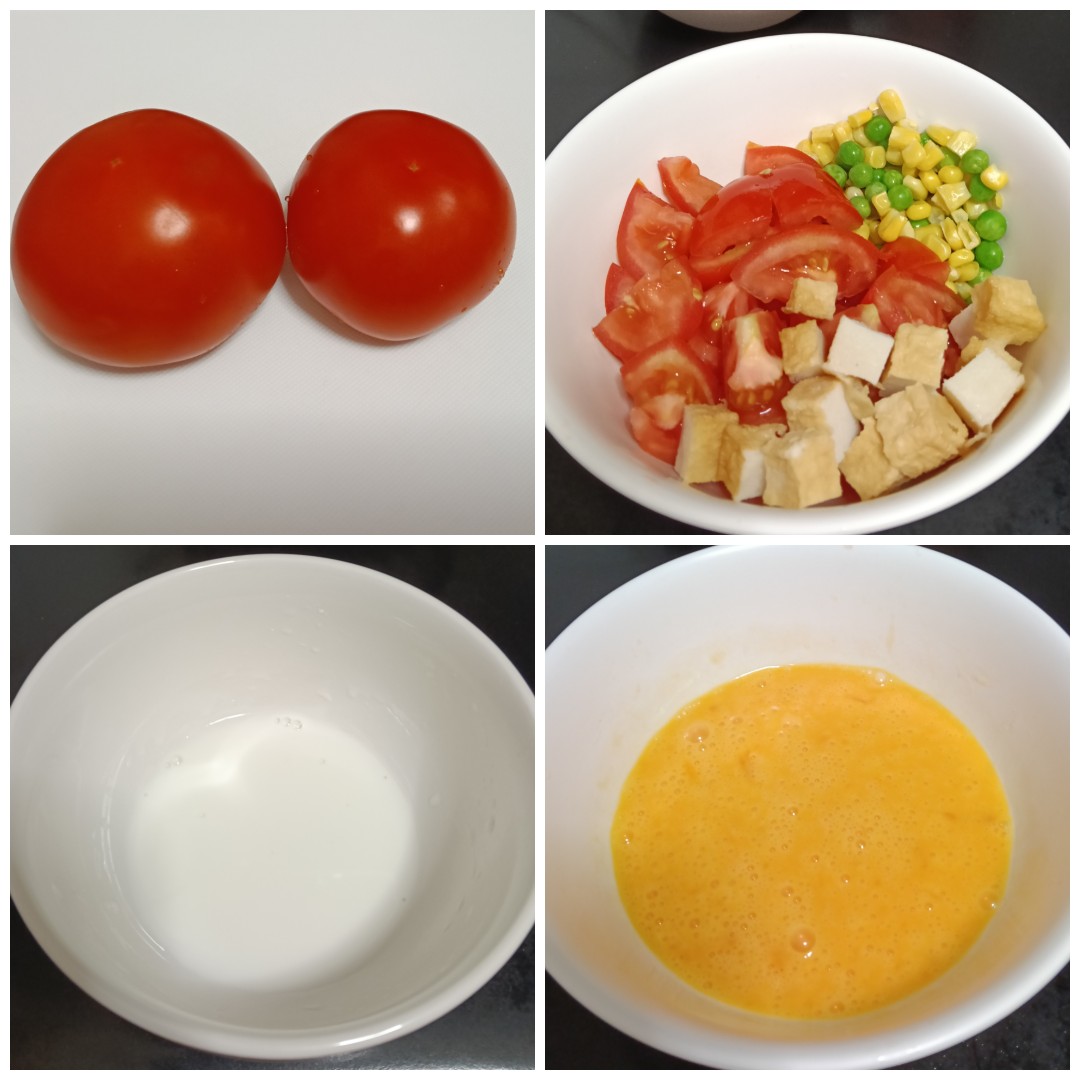 - เตรียมวัตถุดิบ ล้างมะเขือเทศ สับเป็นชิ้นๆ ถั่วลันเตา และข้าวโพดหวานต้มสุก
