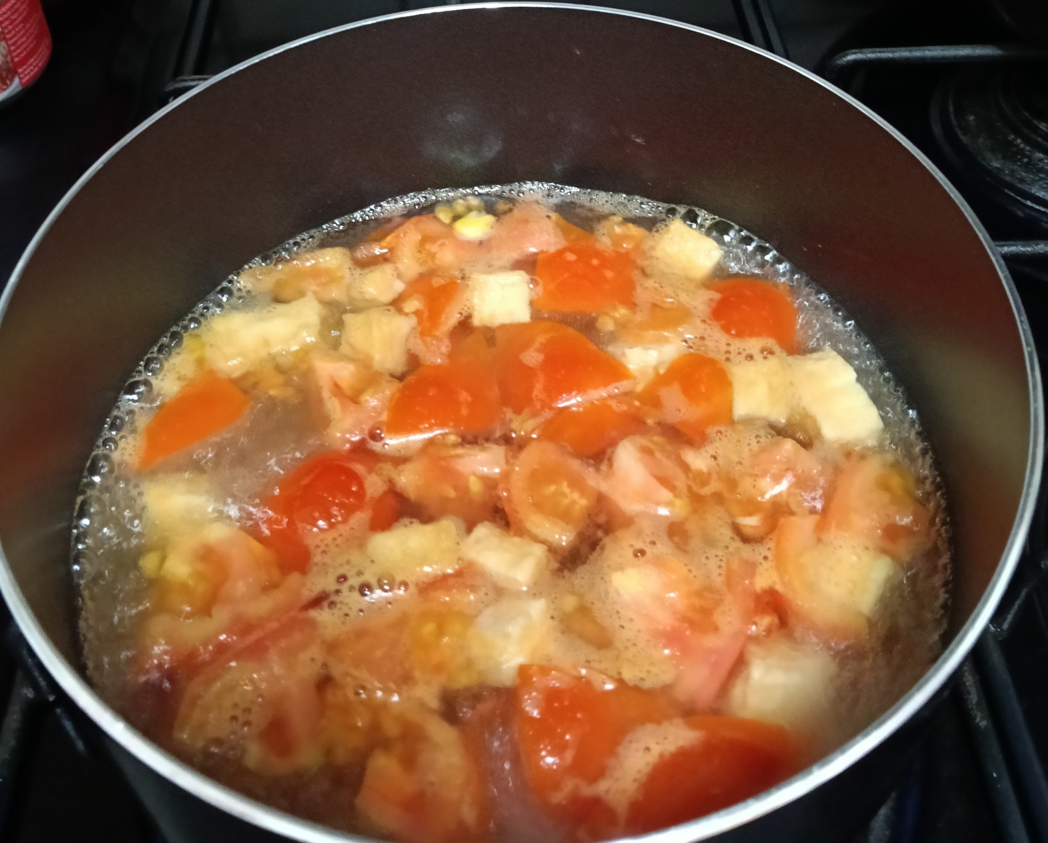- ตั้งหม้อใส่น้ำ พอน้ำเดือดใส่ผงซุปปลา มะเขือเทศ และเต้าหู้ปลาลงไป