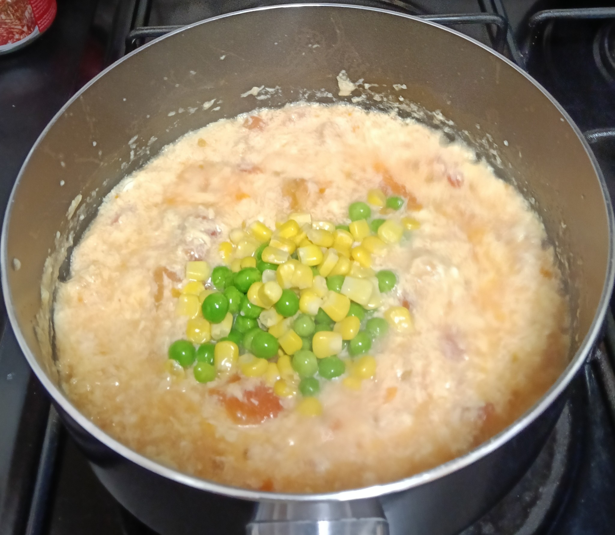 - จากนั้นก็ใส่ข้าวโพดหวานและถั่วลันเตาลงไป