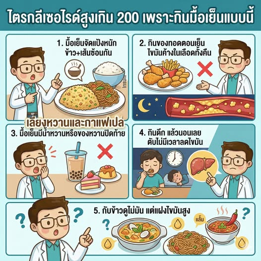 ไตรกลีเซอไรด์สูงเกิน 200 ไม่ได้มาจาก “กินมัน” อย่างเดียว แต่มาจากมื้อเย็นที่แป้งหนัก หวานแฝง ทอดบ่อย กินดึก และนอนเร็วเกินไป เพราะตอนกลางคืนตับจะเปลี่ยนส่วนเกินเป็นไขมันสะสมทันที ถ้าอยากให้ TG ลดลงจริง เริ่มง่ายสุดคือ มื้อเย็นลดแป้งครึ่งหนึ่ง เลี่ยงหวานหลังอาหาร และเดินเบา ๆ หลังมื้อเย็น 10–15 นาที แค่นี้ค่าก็เริ่มลงได้ครับ