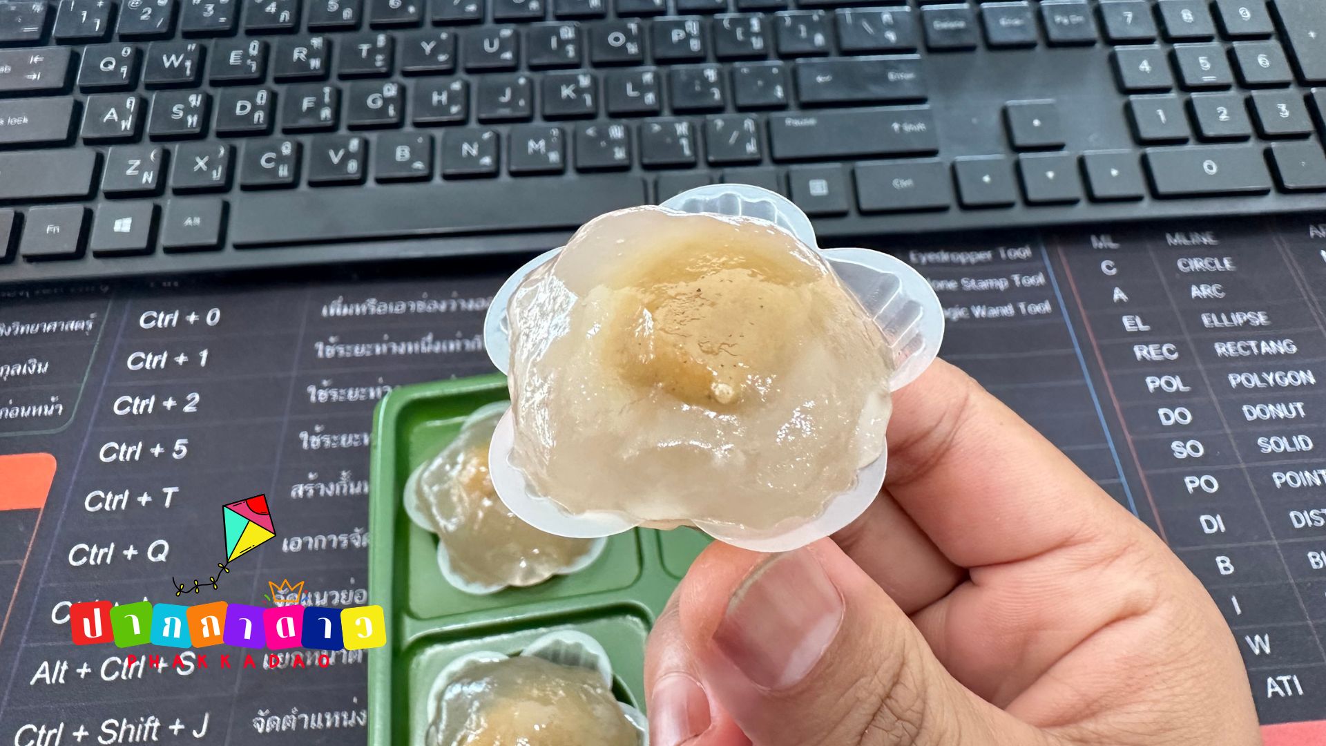 ตัวแป้งใสๆเหมือนแป้งโมจิ จะมีความหวานหน่อยๆ ไส้เป็นไส้เค็มนะจ๊ะ