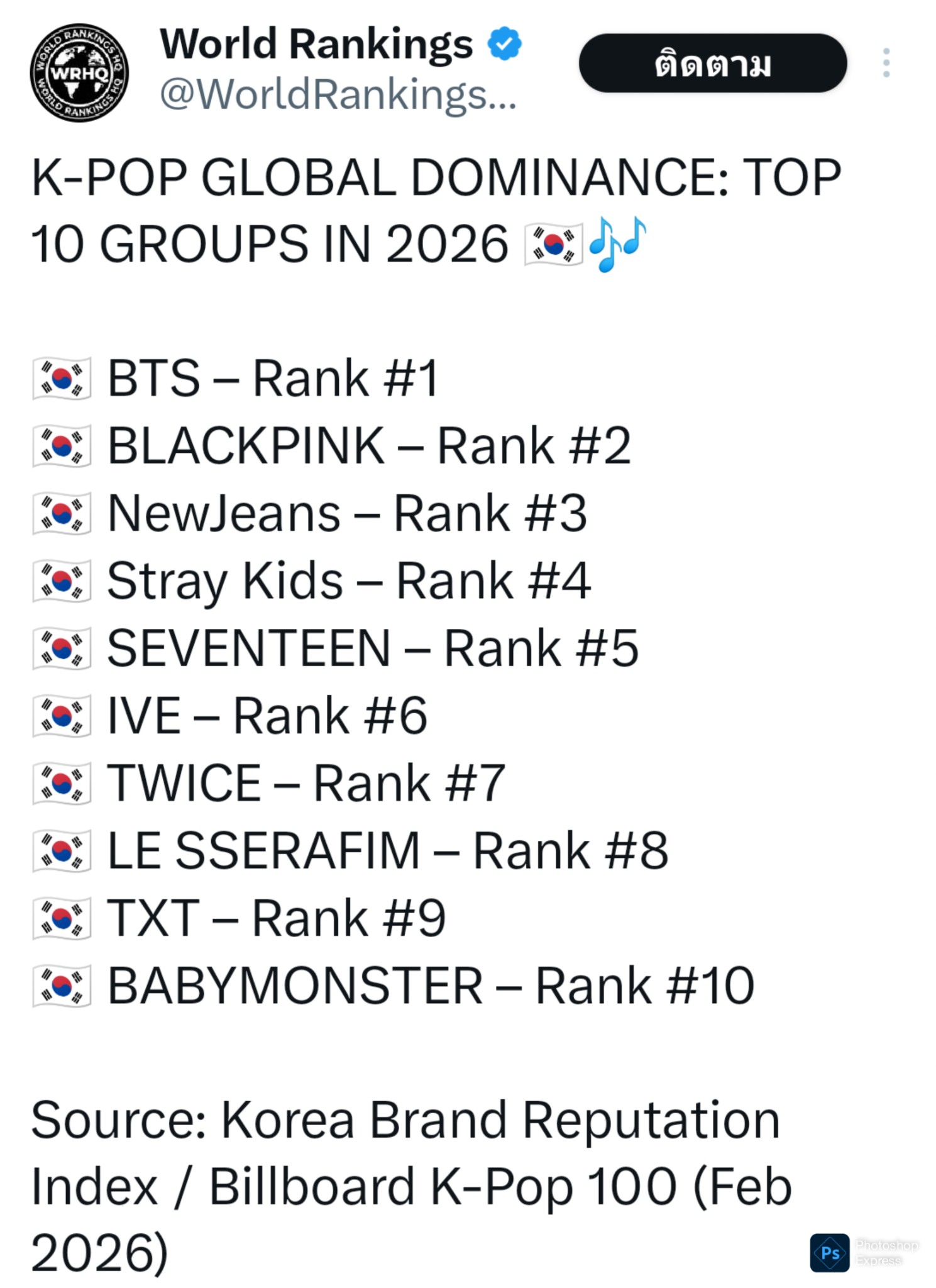 BABYMONSTER เป็นศิลปินเคป๊อปเจน 5 วงเดียวที่อยู่ใน Top 10 ศิลปินเคป๊อปที่ครองความนิยมสูงสุดทั่วโลกในปี 2026