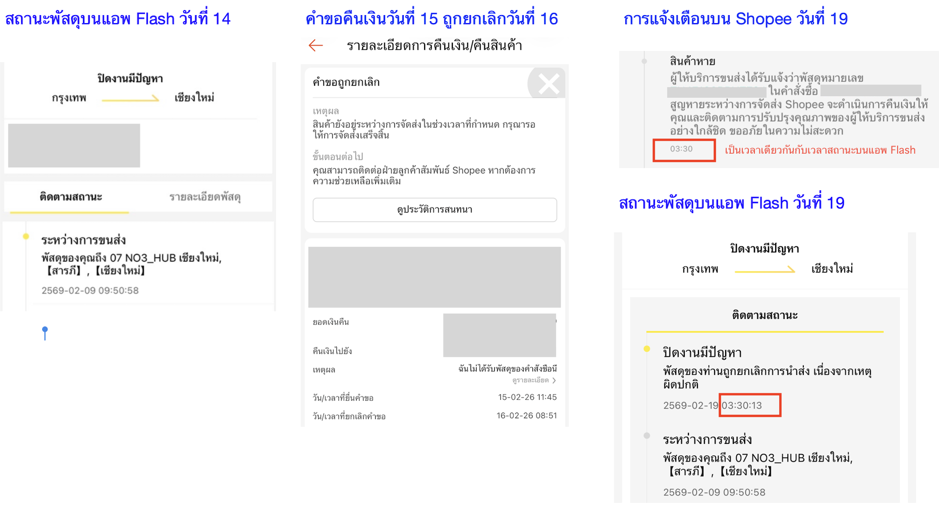 19 ก.พ. มีการแจ้งเตือนบนระบบ shopee เวลา 3:30 ว่า สินค้าหาย เราจึงกลับไปเช็คที่แอพ Flash ก็มีรายการติดตามสถานะรายการสุดท้าย เวลา 3:00 เช่นกัน ถึงตรงนี้เราคิดว่านี่อาจจะเป็นระบบอัตโนมัติหรือไม่เพราะเป็นช่วงเวลาที่ไม่ใช่เวลาทำการปกติ และจะต้องมีสถานะนี้จากทางขนส่งเป็นผู้ส่งเข้ามาก่อนหรือเปล่าทางระบบ Shopee ถึงจะดำเนินการต่อได้ และนี่หรือเปล่าที่ทำให้การขอคืนเงินของเราในครั้งแรกถูกยกเลิก เพราะทางขนส่ง Flash ยังไม่ได้ส่งข้อมูลนี้เข้ามาที่ระบบ Shopee นี่เป็นข้อสันนิษฐานส่วนตัวของเรา