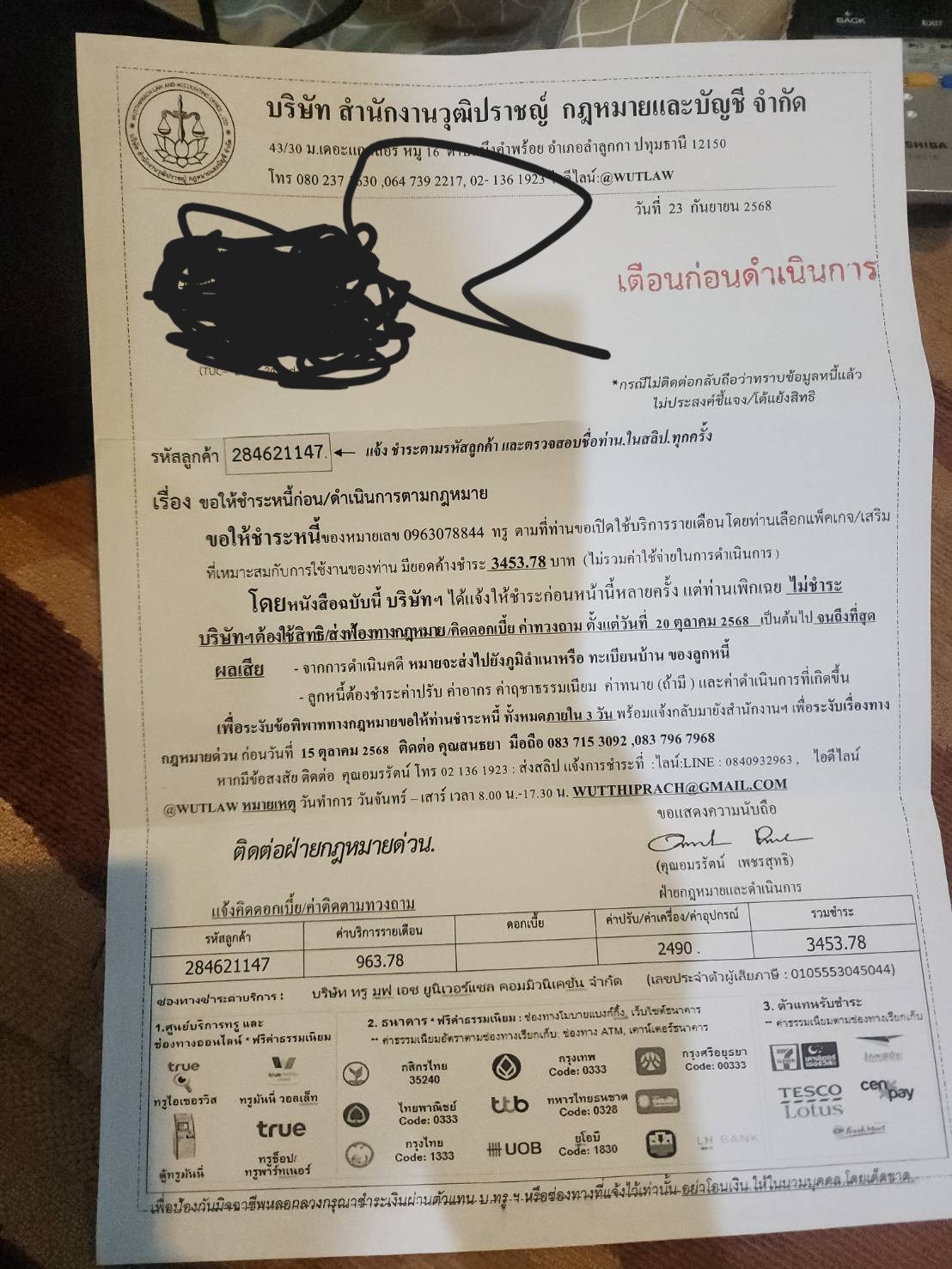 ได้รับจดหมายทวงหนี้จากสำนักงงานกฏหมาย ว่าไม่มีการจ่ายชำระค่างวดทั้งที่ได้มีการปิดเบอร์ไปก่อนหน้าที่จะย้ายมาต่างประเทศ ตั้งแต่มกราคม 2025 และได้มีการเช็คการใช้งานทุกเดือนสำหรับเบอร์ที่ยังใช้งานอยู่ ไม่มีการแจ้งเตือน ไม่มียอดในใบแจ้งหนี้ในแอพลิเคชั่น True iservice ไม่มียอดค้างชำระ ไม่มีจดหมายเตือนอะไรเลย แล้วแบบนี้ต้องทำยังไง ติดต่อ True ก็ให้คุยกับ AI