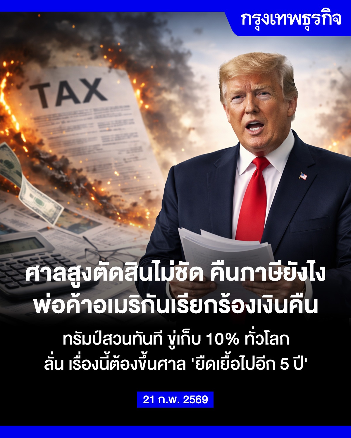ศาลสูงตัดสินไม่ชัด คืนภาษียังไง พ่อค้าอเมริกันเรียกร้องเงินคืน ทรัมป์สวนทันที ขู่เก็บ 10% ทั่วโลก ลั่น เรื่องนี้ต้องขึ้นศาล ‘ยืดเยื้อไปอีก 5 ปี’
