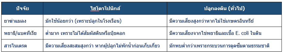 - ปลูกลงดิน: ผักจะมี "กลิ่นหอมเฉพาะตัว" (Aroma) ที่เข้มข้นกว่า และเนื้อสัมผัสจะมีความเหนียวนุ่มหรือแน่นกว่าตามธรรมชาติ