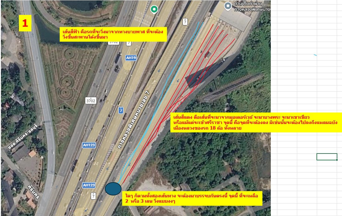 ผมก็ยังงง ไม่รู้อะไร ถึงทำให้มีจุดลงตรงจุดนี้จุดเดียว เอาจริงๆ ศรีราชานี่คือเมืองใหญ่ แต่พี่กลับให้มาลงตรงจุดนี้ แล้วขอโทษทีครับ จุดนี้กว่าจะวิ่งไปถึงเมืองศรีราชา เส้นข้างๆ มอเตอร์เวย์ พี่ๆ เอางบประมาณไปทำมอเตอร์เวย์เสียเงิน แล้วพวกกระผมก็เสียภาษี แต่พี่มาบังคับให้ผมลงตรงนี้ ถนนสองเลน และที่สำคัญขยันทำซะด้วย เดือนกย. เอาแล้ว แทบทุกปี ใครเคยมาจุดต้องรู้ดี