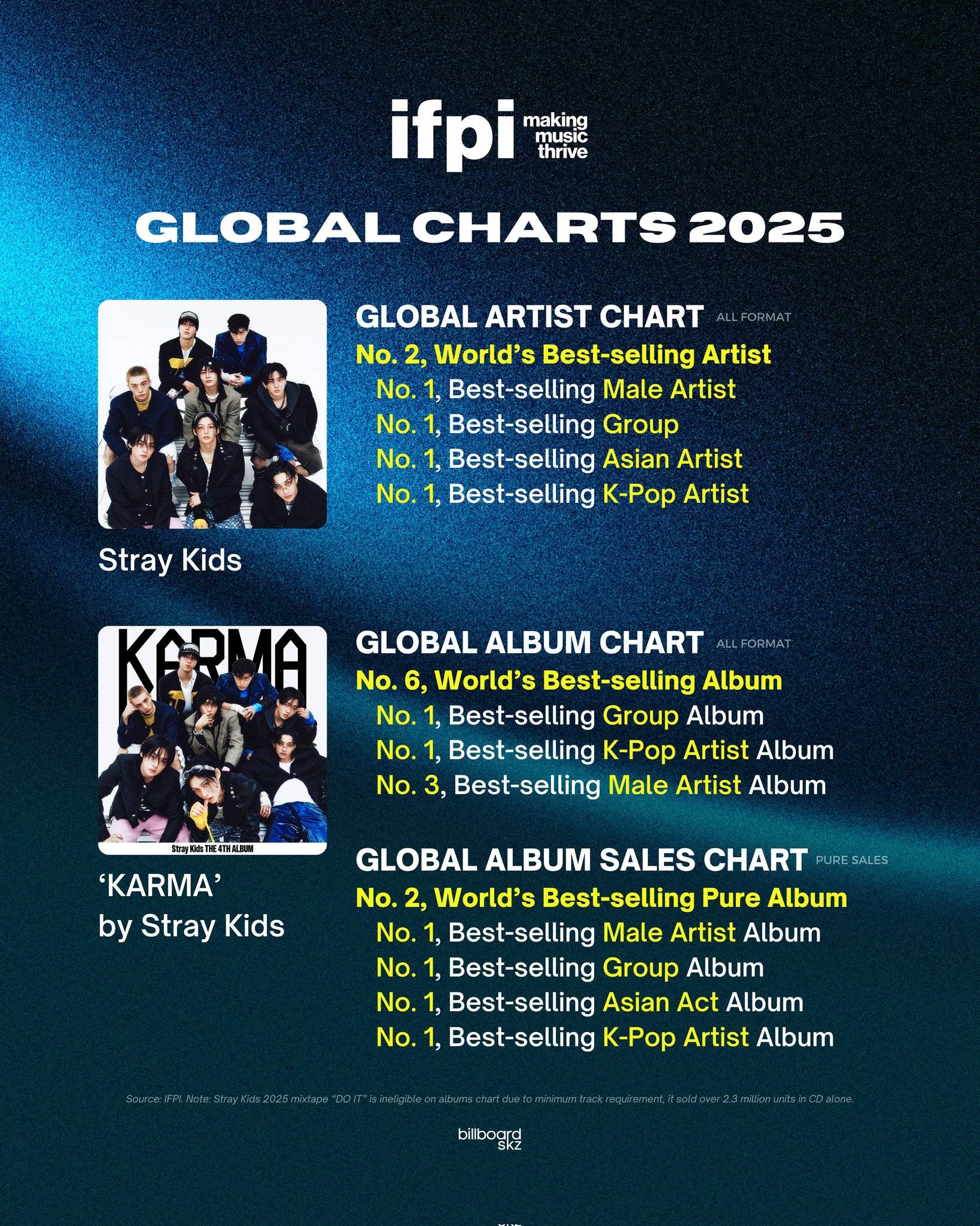 🔥 Stray Kids ได้กลายเป็นศิลปิน K-Pop เพียงกลุ่มเดียวที่ติดอันดับในหลายหมวดหมู่ของศิลปิน K-Pop ที่ขายดีที่สุดทั่วโลกประจำปี 2025 (ตามการจัดอันดับของ IFPI) รวมถึงศิลปินยอดนิยมและอัลบั้มยอดนิยม