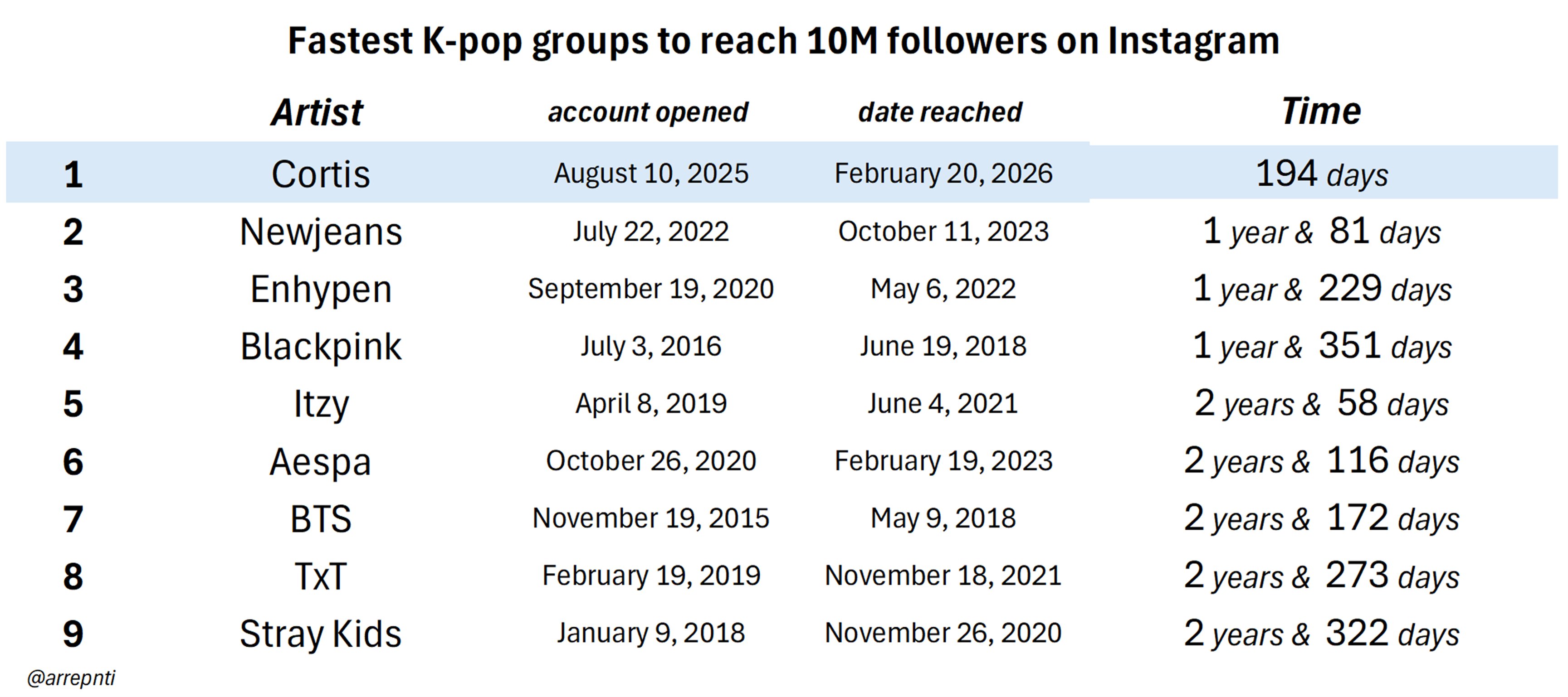 Cortis กลายเป็นวงเคป็อปที่ทำสถิติเร็วที่สุดในประวัติศาสตร์ที่มียอดผู้ติดตาม 9 ล้านคนบนอินสตาแกรม โดยใช้เวลาเพียง 155 วัน!! พวกเขายังคงเป็นบอยกรุ๊ปเจน 5 ที่มีผู้ติดตามมากที่สุดบนแพลตฟอร์มนี้!