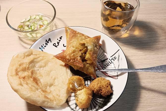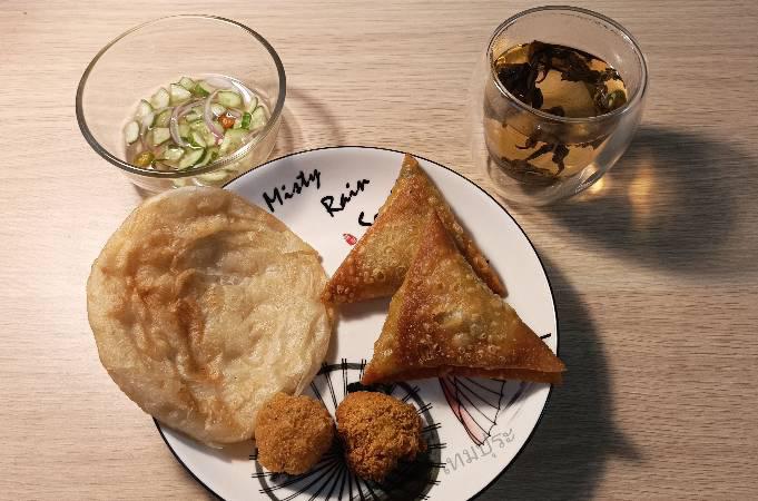 อาหารมื้อเย็น >> ซาโมซา ถั่วทอด และยอดชา