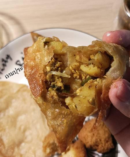 ส่วนที่ได้มาวันนี้เป็นซาโมซาไส้เนื้อผัดกับมันฝรั่ง หอมหัวใหญ่ และเครื่องเทศ