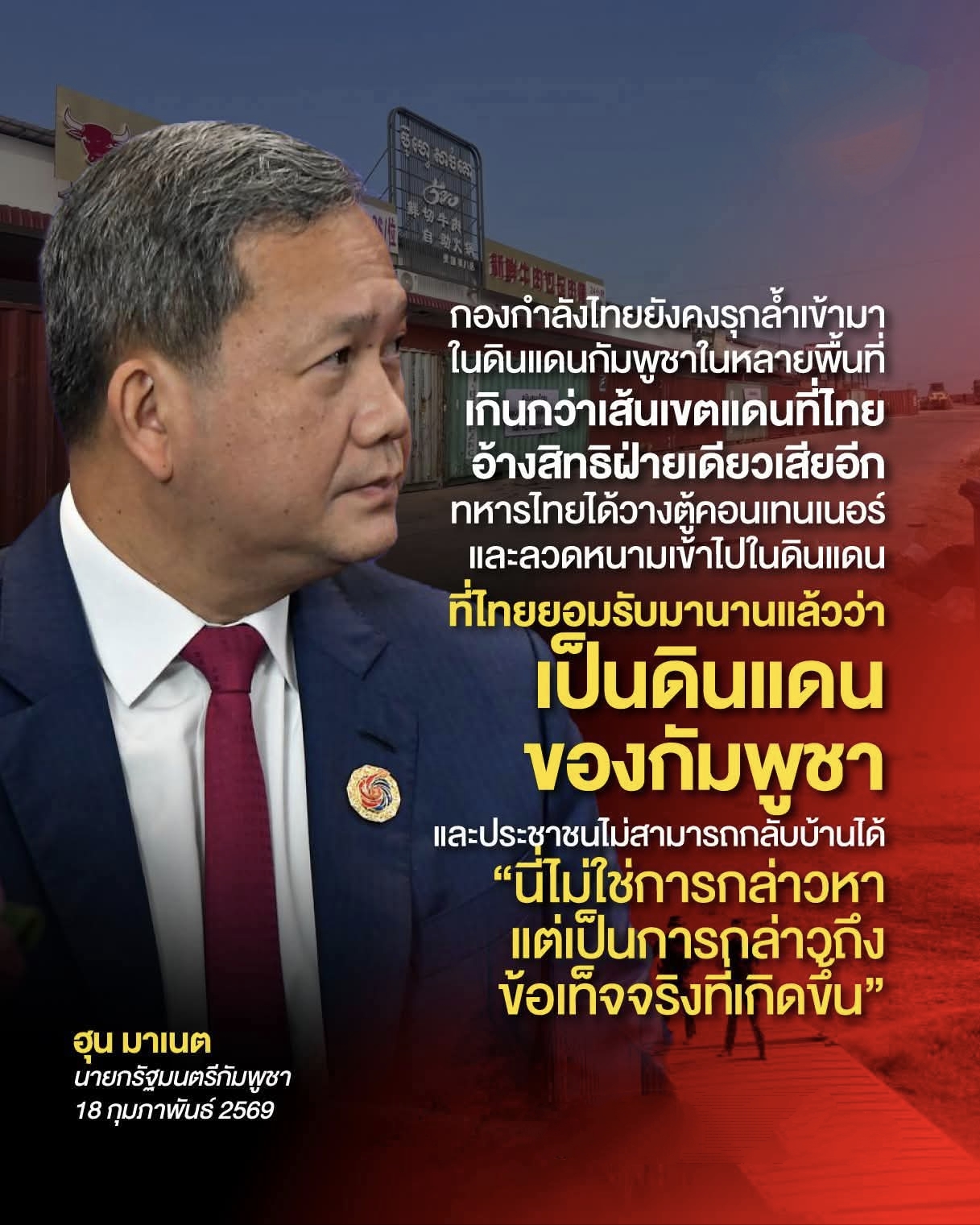 สมเด็จฯ ฮุน มาเนต นายกรัฐมนตรีกัมพูชา ให้สัมภาษณ์สำนักข่าว รอยเตอร์ อ้าง ไทยรุกล้ำอธิปไตยกัมพูชา ผมยืนยันได้ นี่คือข้อเท็จจริงทั้งหมด