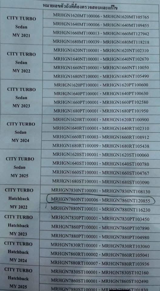 - เข้าใจว่า City Turbo น่าจะ Recall เกือบทั้งหมด ลองดูแล้ว เลขตัวถังผมอยู่ใน list แต่เช็คเลขตัวถังใน web honda ยังไม่ขึ้น (ยังไม่ได้อัพเดทข้อมูลมั้ง) .. เอาว่า ใครว่าง ก็ติดต่อศูนย์ไปนะครับ เคลมได้หมด ต่อให้เปลี่ยนเป็นท่อทองเหลืองมาแล้วก็เคลมได้ ยกเว้น กรณีเดียว คือ เปลี่ยนหม้อน้ำเป็นอลูมิเนียม ของแต่งแล้ว อันนี้อด