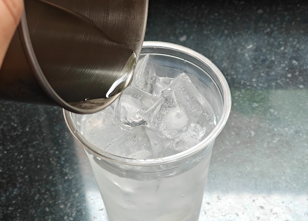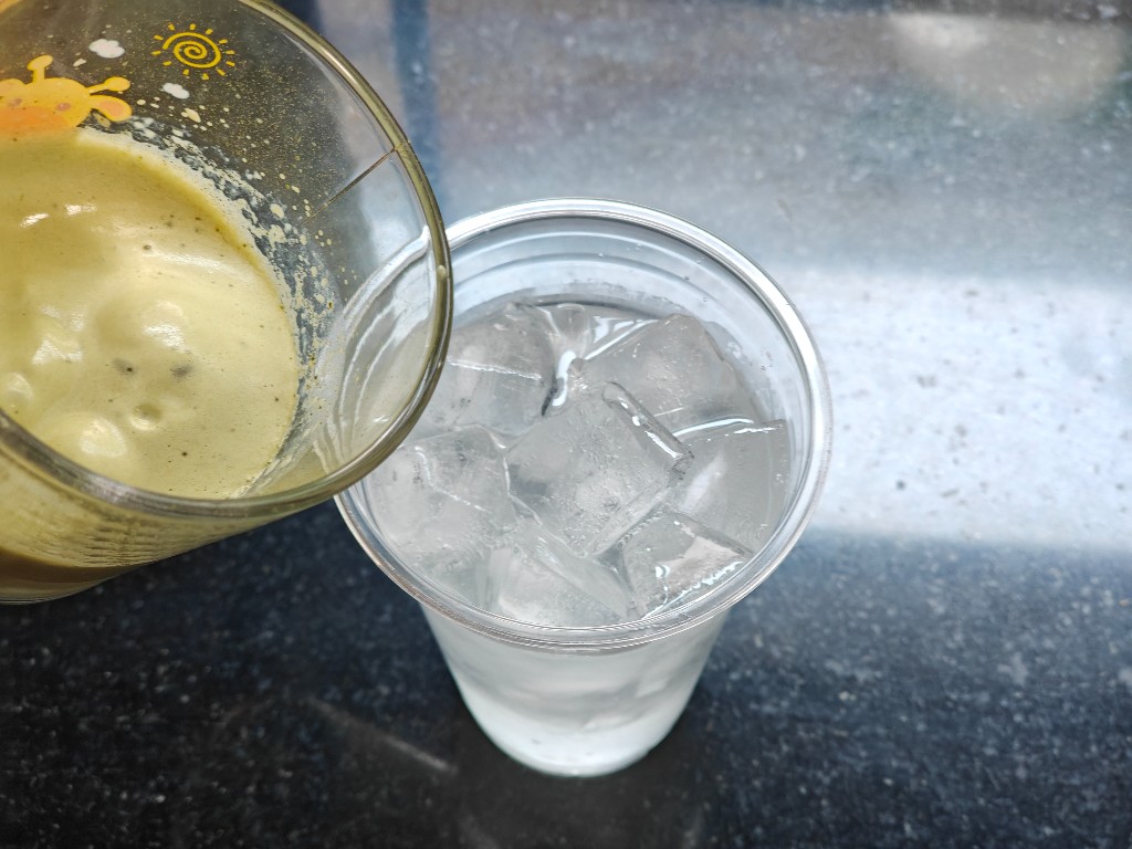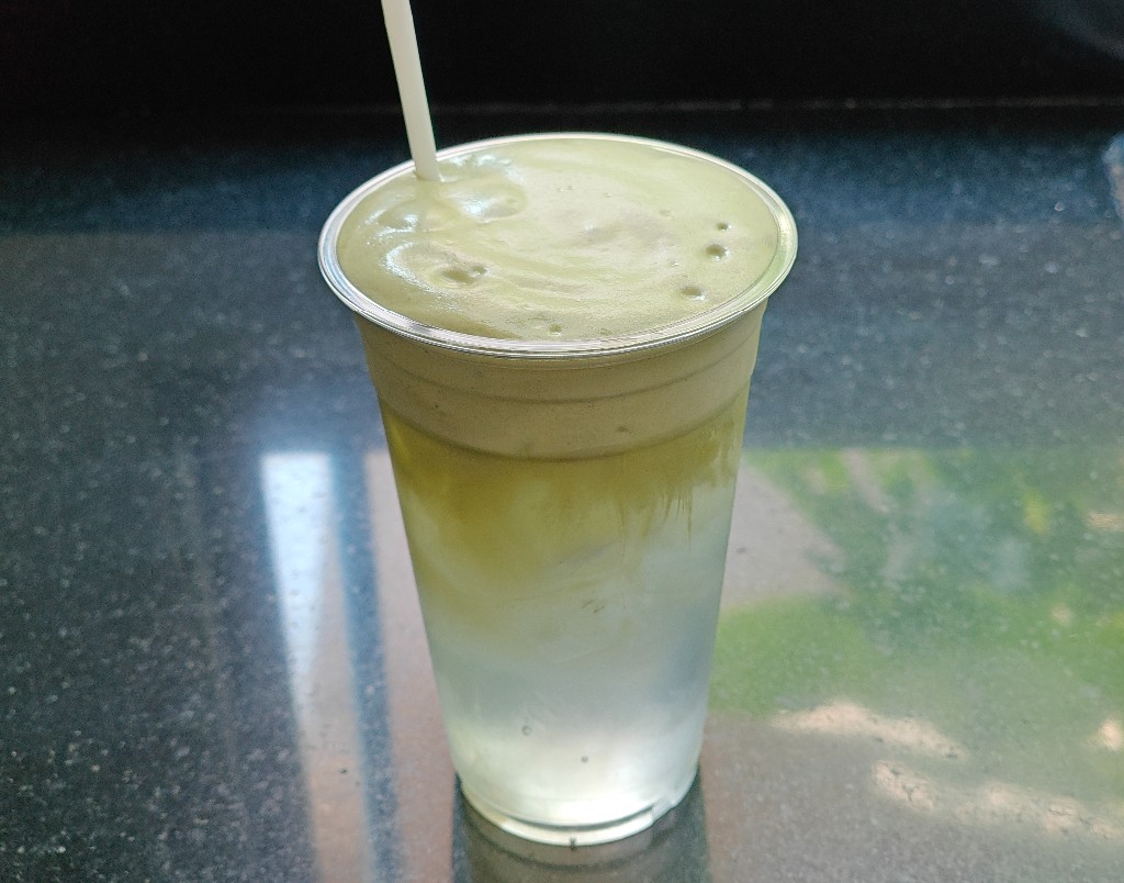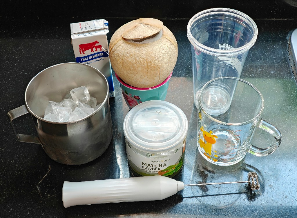 ส่วนประกอบมีแค่น้ำมะพร้าว ผงมัทฉะ น้ำแข็ง นมรสจืด และตัวช่วยเครื่องตีฟองนม