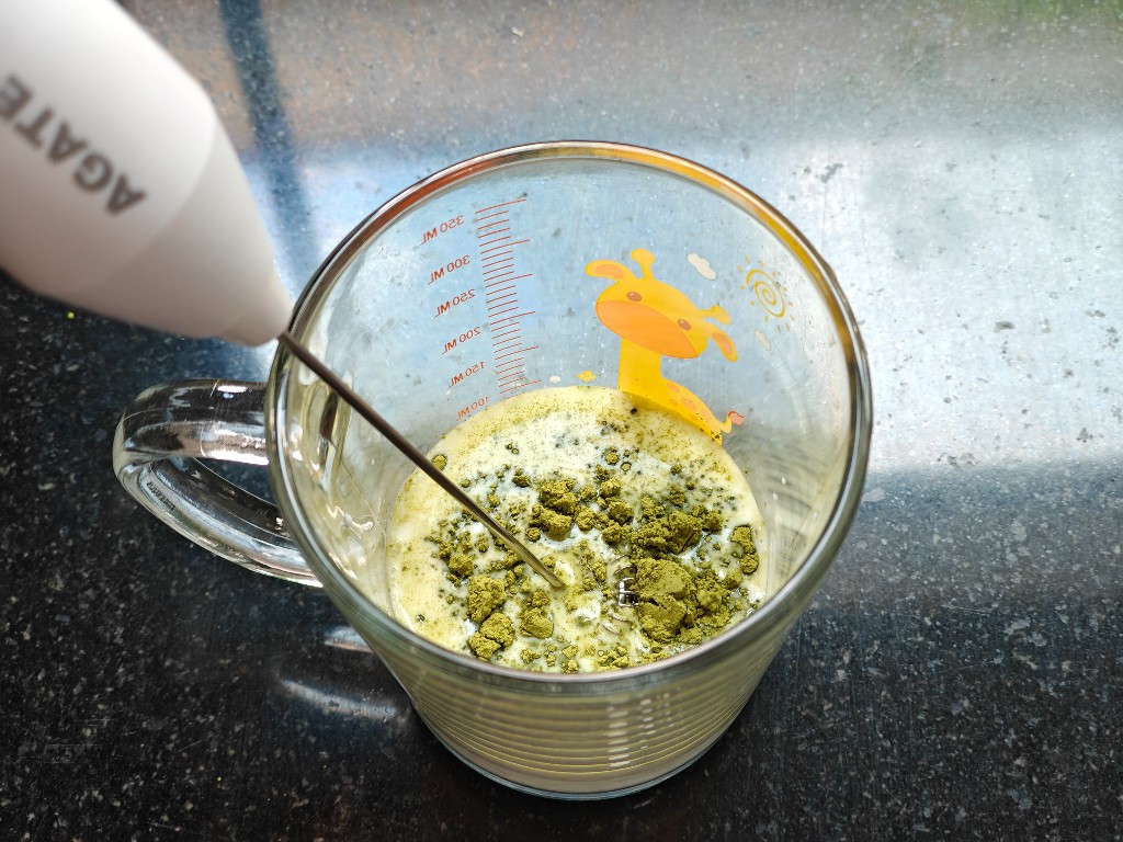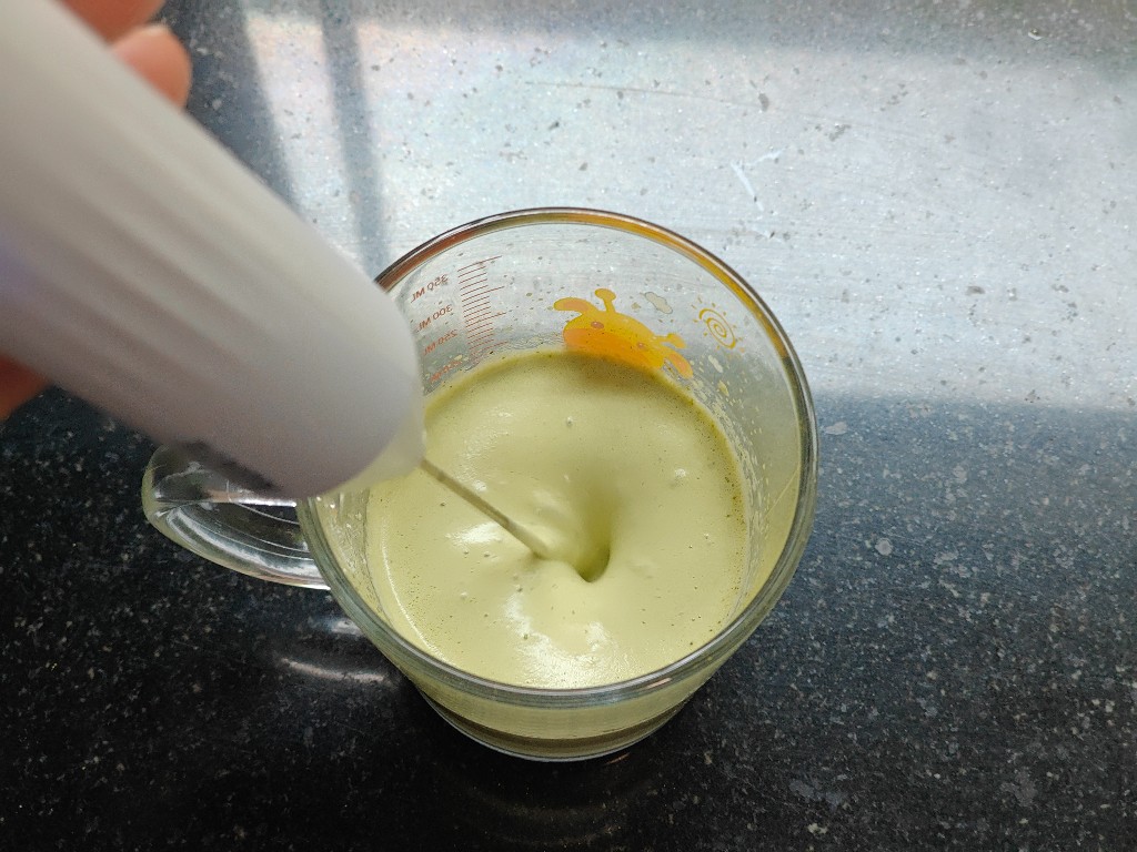 ขั้นตอนทำง่ายๆไม่ยุ่งยาก แช่นมให้เย็นจัดพอได้ที่แล้ว เทนมลงใส่แก้วประมาณ 50 ml เทผงมัทฉะตามลงไป 1 ช้อน คนๆแล้วใช้เครื่องตีฟองนมช่วยตีพร้อมปรับความเร็ว ตีไปซักพักจะขึ้นฟูเป็นโฟมเนื้อนมและมัทฉะเข้ากันเนียนดีเลยค่ะ