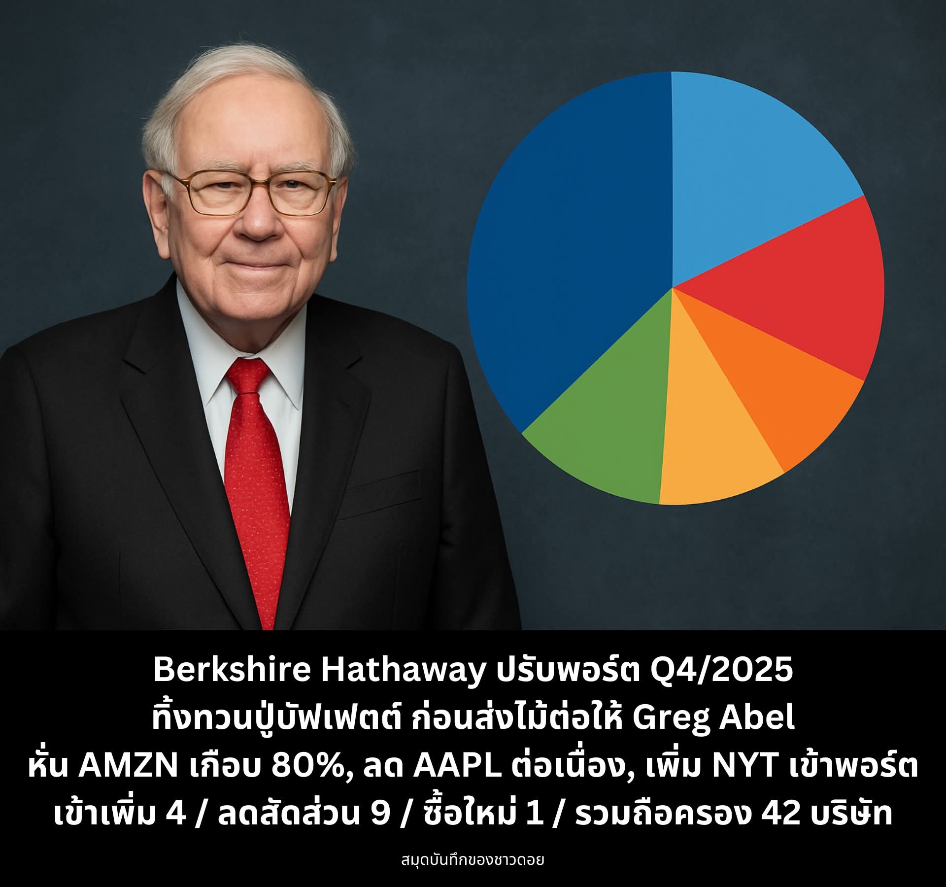 พอร์ตทิ้งทวนของปู่บัฟเฟตต์แสดงให้เห็นถึงความระมัดระวังอย่างมาก โดยเฉพาะการลดสัดส่วนหุ้นเทคโนโลยีและการเงินที่เคยเป็นเสาหลัก เพื่อสะสมเงินสดไว้รองรับความผันผวนในยุคของ Greg Abel แต่ในขณะเดียวกันก็ยังทิ้ง "หมัดเด็ด" ด้วยการเข้าซื้อสื่อเก่าแก่แต่ทรงพลังอย่าง NYT และเพิ่มน้ำหนักในกลุ่มพลังงานและประกันภัยที่เป็นของชอบดั้งเดิม