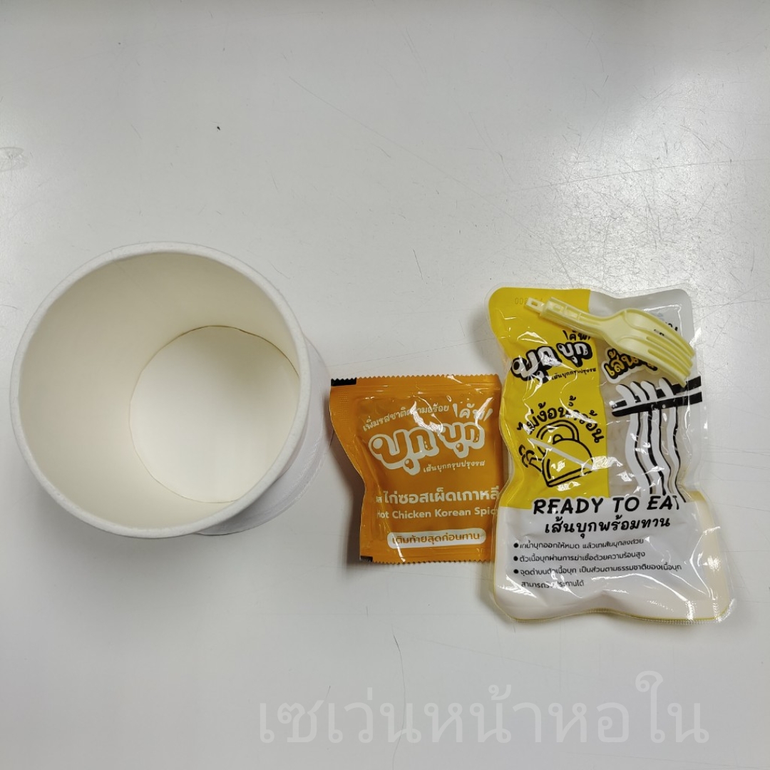 จากนั้นตัดซองให้กว้างๆ เทเส้นบุกใส่ถ้วยลงไปครับ