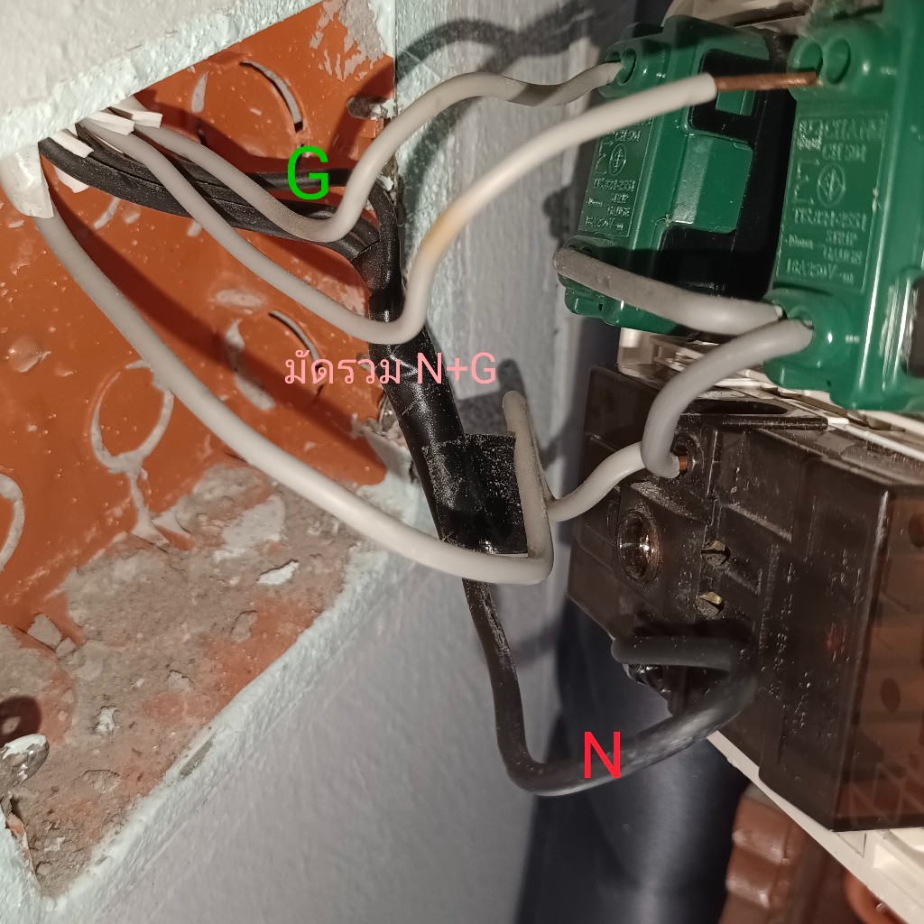 ส่วนอีกเต้า เขาก็เอาสายดิน ไปมัดรวมกับสาย L เเล้วก็เสียบที่รู L อย่างเดียว