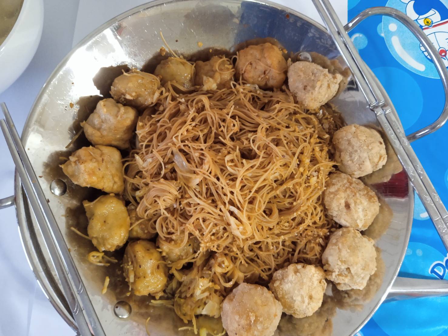 เส้นหมี่ขาวแห้งคลุกน้ำซอสก๋วยเตี๋ยวเรือ หวานเค็มเผ็ดครบรส ลูกชิ้นแคระทอดกรอบ ลูกชิ้นแคะกุ้งหนึบ ลูกชิ้นแคะหมูหนึบ ซดน้ำซุปตีนไก่และหัวไชเท้า แกล้มผักบุ้งลวกใส่น้ำมันงาหอม ๆ คลีนจริงไม่ติงนังค่า