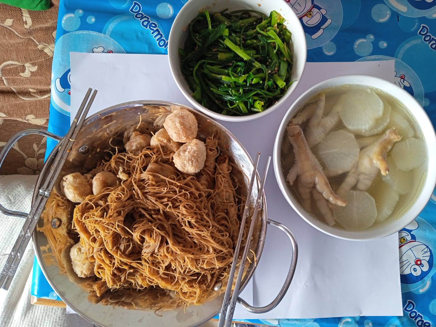 เส้นหมี่และลูกชิ้นแคะคลุกซีอิ๊ว + น้ำซุปตีนไก่ไชเท้า + ผักบุ้งลวก เป็นเมนูที่ทำได้ไม่ยาก ง่าย ๆ คลีน ๆ ดีต่อสุขภาพ และอิ่มอร่อยค่ะ