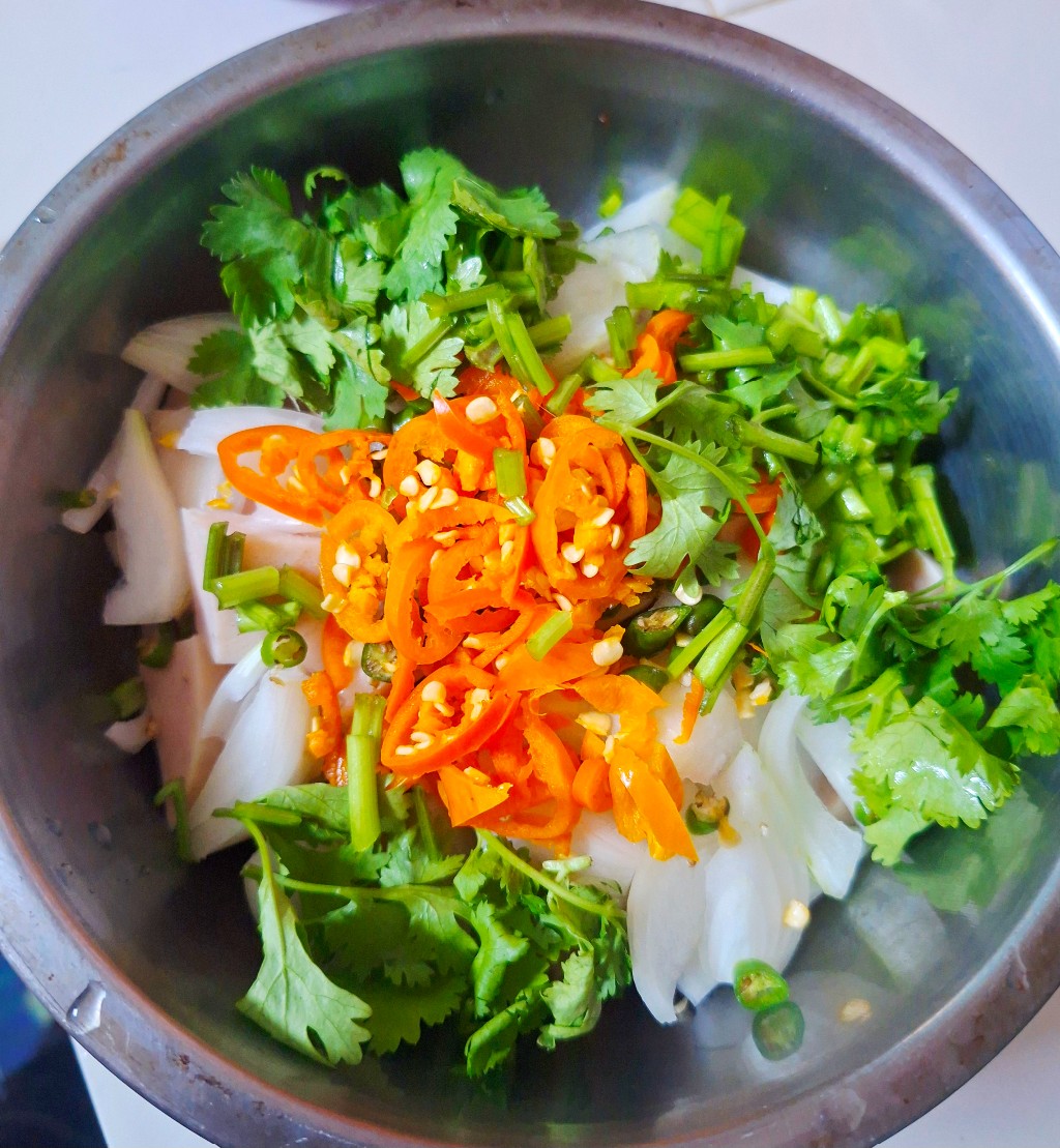 หั่นหมูยอ หั่นผัก หั่นพริก ใส่ชามผสม