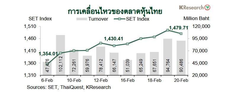 สำหรับสัปดาห์ (23-27 ก.พ. 69) บริษัทหลักทรัพย์กสิกรไทย จำกัด มองว่า ดัชนีหุ้นไทยมีแนวรับที่ 1,465 และ 1,440 จุด ขณะที่แนวต้านอยู่ที่ 1,500 และ 1,510 จุด ตามลำดับ