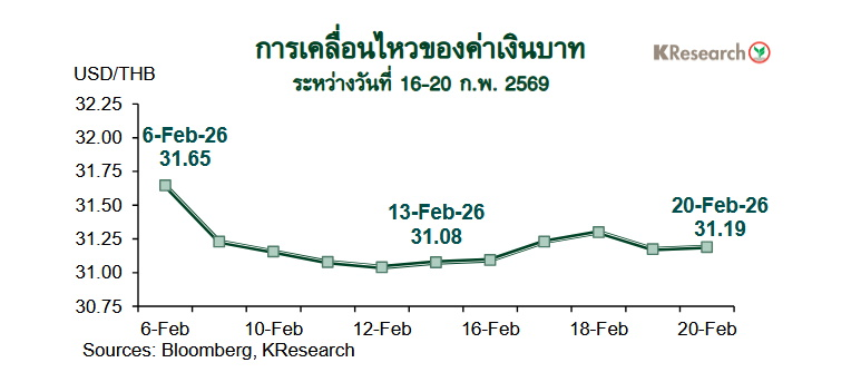 สำหรับสัปดาห์ระหว่างวันที่ 23-27 ก.พ. 2569 ธนาคารกสิกรไทยมองกรอบการเคลื่อนไหวของค่าเงินบาทที่ระดับ 30.90-31.60 บาทต่อดอลลาร์ฯ