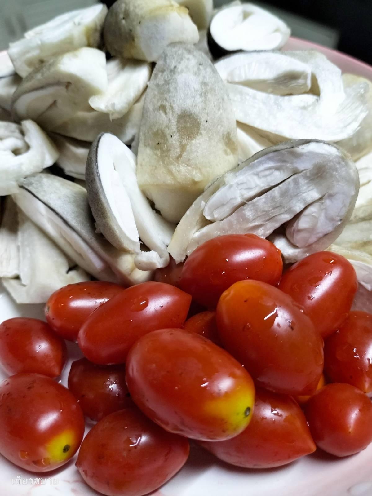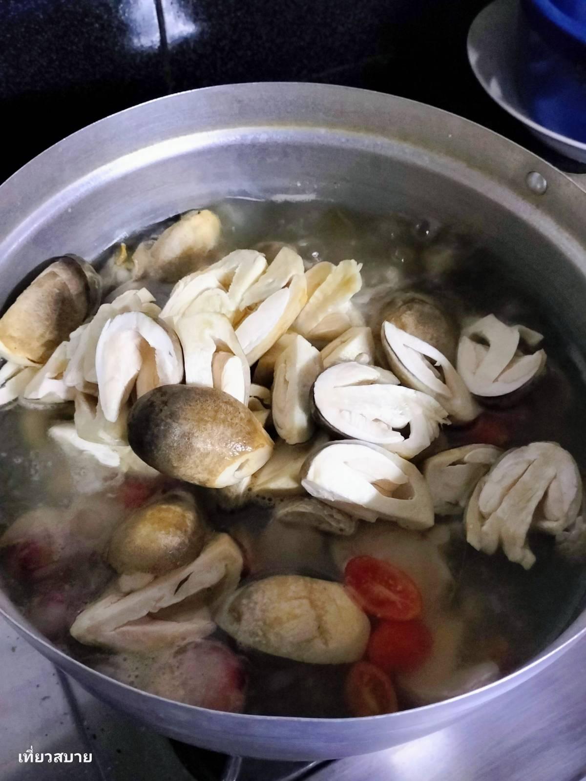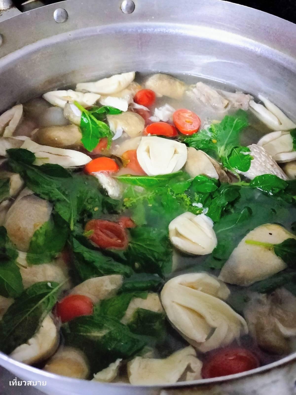 เมื่อปลาใกล้สุก ใส่เห็ดฟางและมะเขือเทศลงไป ต้มต่อให้ความหวานธรรมชาติออกมา