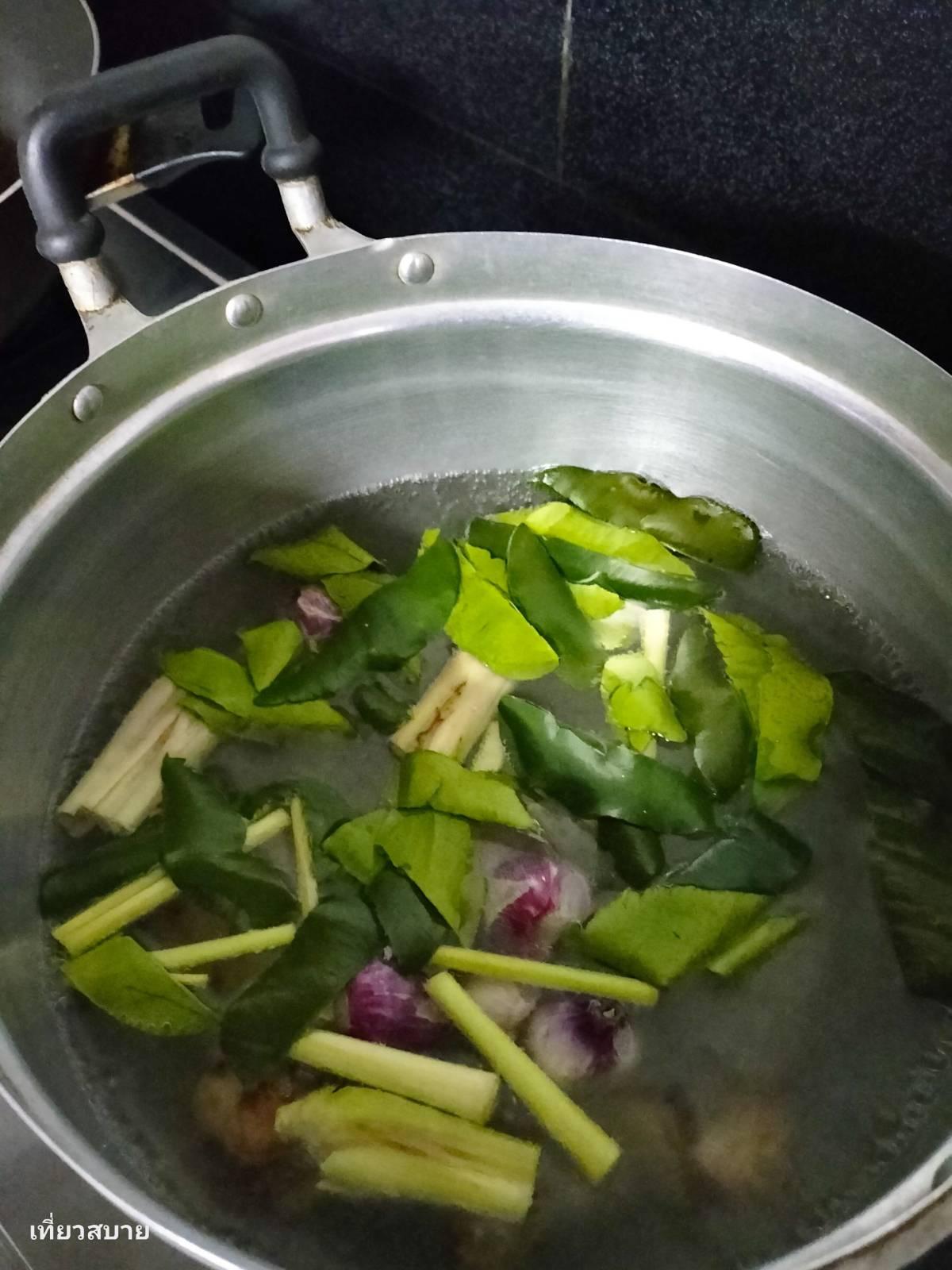 ตั้งน้ำให้เดือด ใส่ข่า ตะไคร้ ใบมะกรูด หอมแดง เกลือ และมะขามเปียก มะขามจะช่วยให้รสเปรี้ยวอมหวานและกลมกล่อมแบบธรรมชาติ