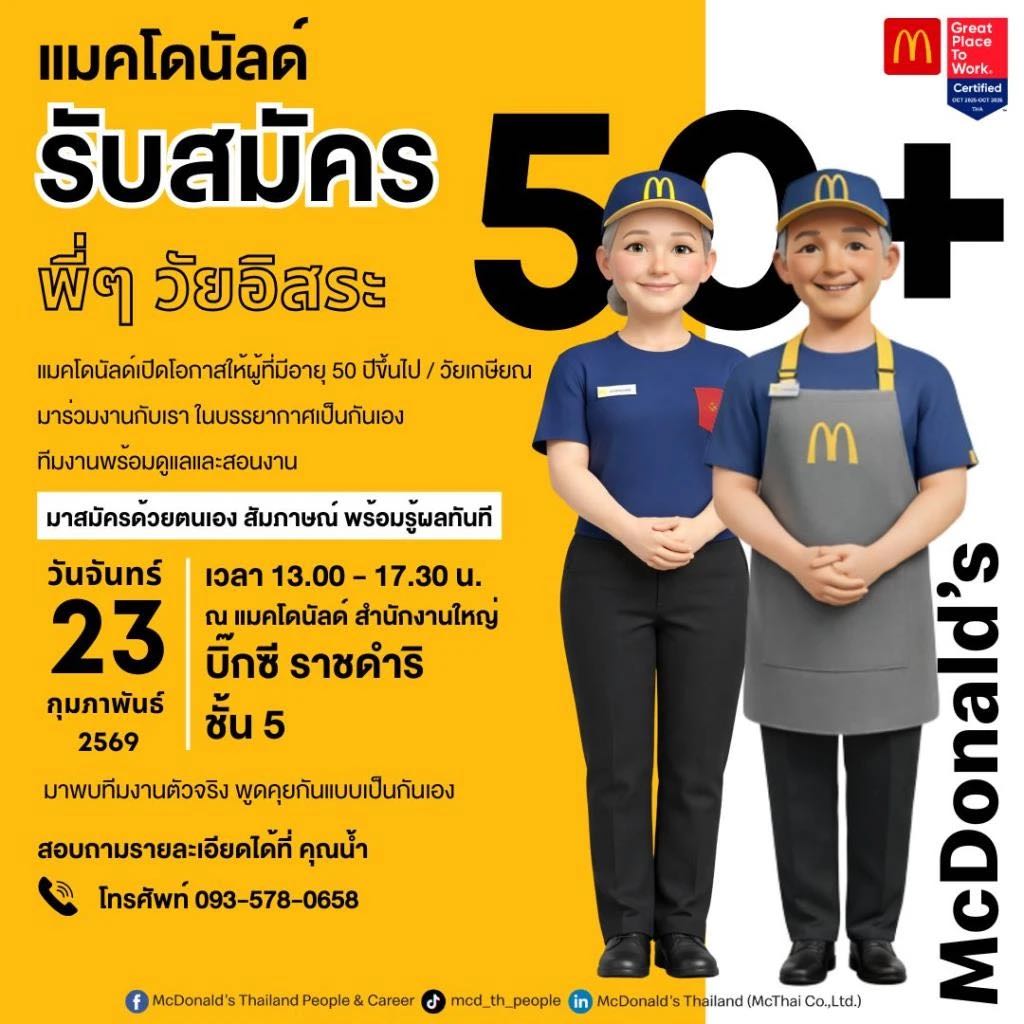 ล่าสุด บริษัท แมคไทย จำกัด หรือร้านแมคโดนัลด์ ประเทศไทย เปิดรับสมัครงานสำหรับวัยอิสระ 50 ปีขึ้นไป หรือวัยเกษียณ มาร่วมงานในตำแหน่งพนักงานประจำร้าน McDonald's ทำหน้าที่รับออเดอร์ เตรียมอาหาร ดูแลลูกค้า รักษาความสะอาด โดยทำงานเป็นทีม เหมาะสำหรับวัยเกษียณ ผู้ที่อยากมีรายได้เสริม และอยากใช้เวลาว่างให้มีคุณค่า โดยเปิดรับสมัครแบบวอล์กอิน ในวันจันทร์ที่ 23 ก.พ. 2569 เวลา 13.00-17.00 น. ที่อาคารบิ๊กซี ราชดำริ ชั้น 5 (ออฟฟิศแมคโดนัลด์)