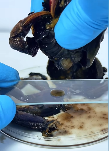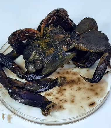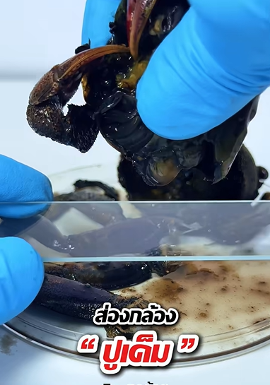 ส่องเฉพาะน้ำดำๆ ของปูเค็ม โดยหักกร้ามปูและบีบน้ำออกมา
