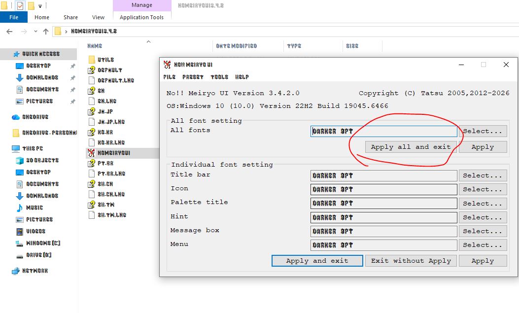ตัวโปรแกรม noMeiryoUI v3.4.2 (หาโหลดได้จาก GitHub ของผู้พัฒนา) https://github.com/Tatsu-syo/noMeiryoUI