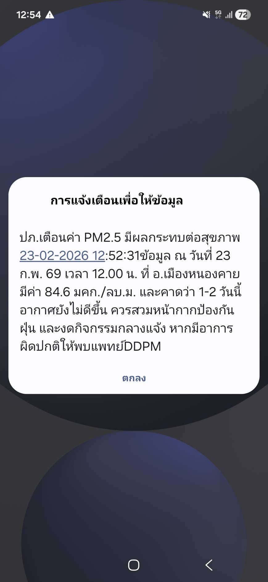 ⚠️ เตือนภัยชาวเมืองหนองคาย PM 2.5 วันนี้ (23 ก.พ. 69) ค่าฝุ่นโหดมาก ค่าเฉลี่ย 24 ชม. พุ่งไป 85.1 แล้ว!