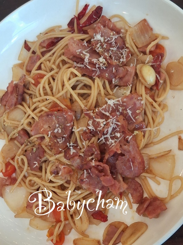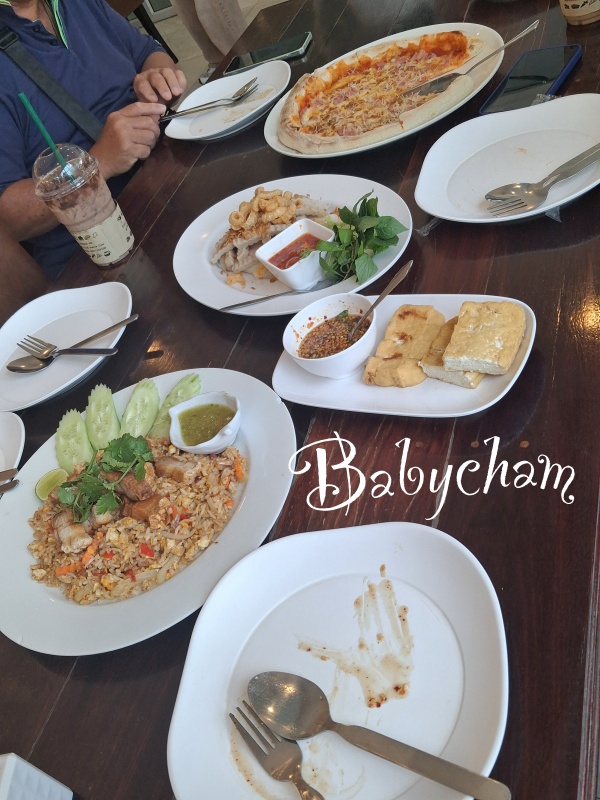 ส่วนใหญ่เด็กๆ จะจัดการสั่งอาหารค่ะ ผู้ใหญ่มีไม่กี่อย่าง เพราะพี่ๆ และแม่เปปต่างก็กินอะไรรองท้องมาจากบ้านบ้างแล้ว นั่งคุยสนทนากันซะมากกว่า ด้วยไม่ได้เจอกันนานหลายเดือนมาก และจานนี้ ก็สปาเก็ตตี้พริกแห้งเบคอน
