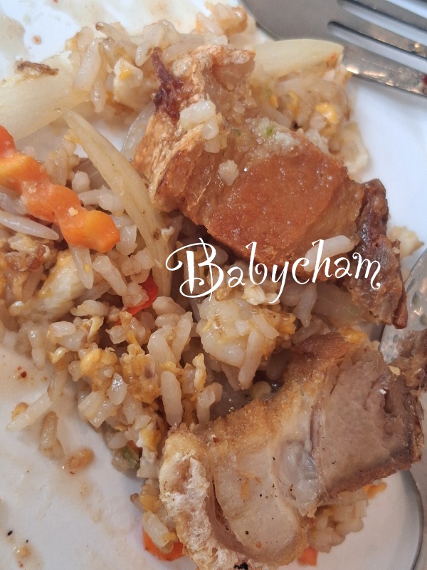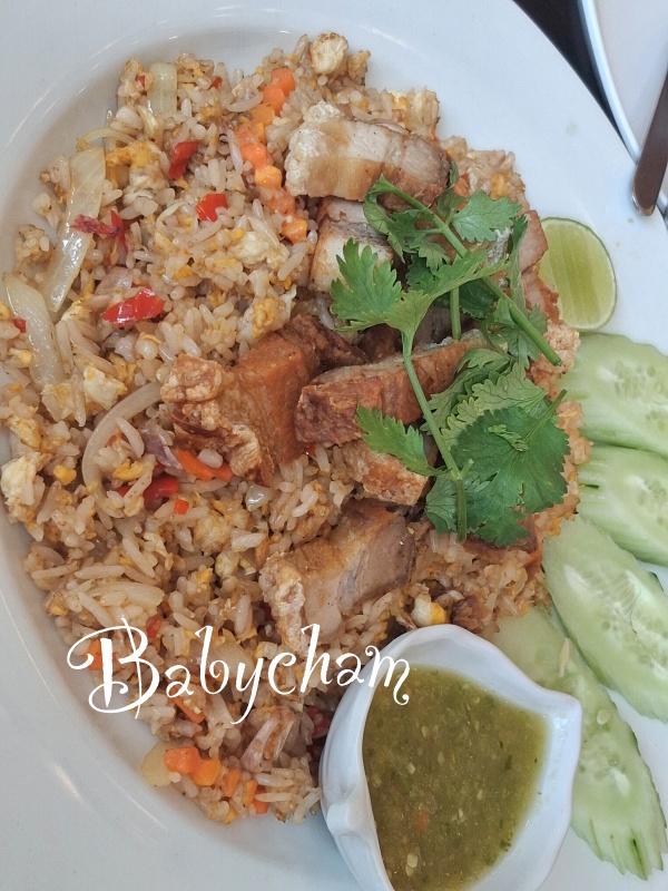 ข้าวผัดหมูกรอบค่ะ มีรสเผ็ดนิดนึง นิดเดียวเอง แต่เด็กๆก็กินได้ทุกคน