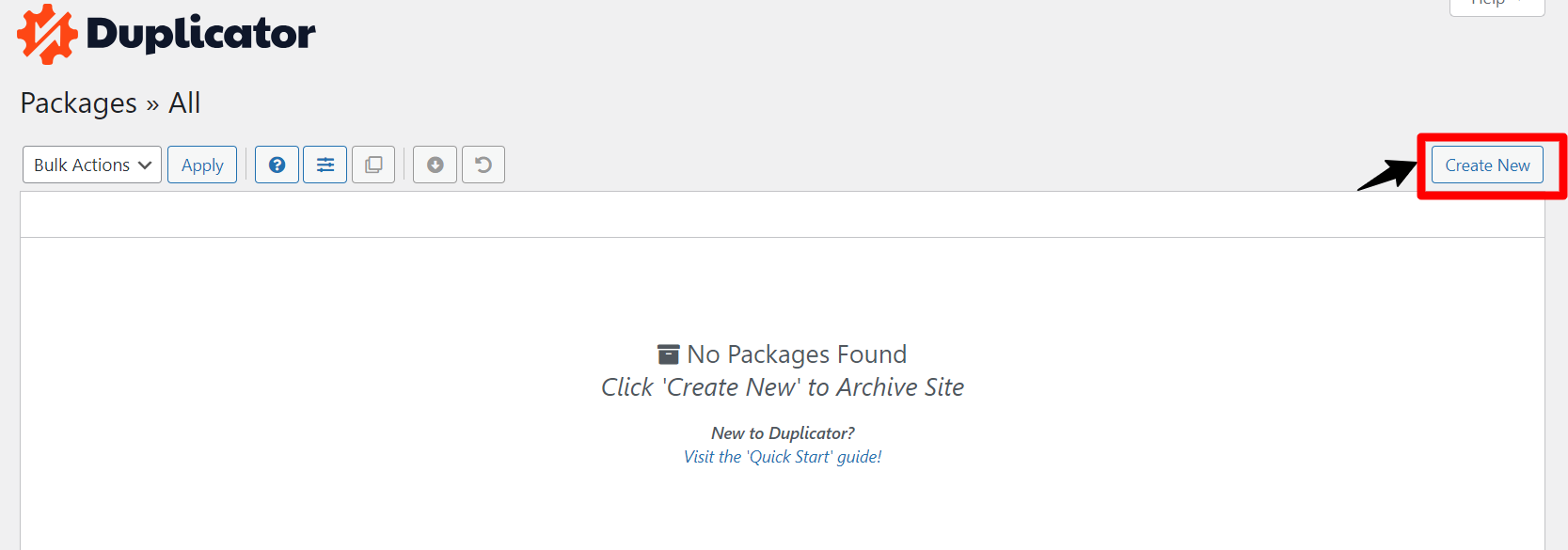 เข้าไปที่หน้าแดชบอร์ดของ Duplicator แล้วกดปุ่ม Create New เพื่อเริ่มสร้างชุดข้อมูลใหม่