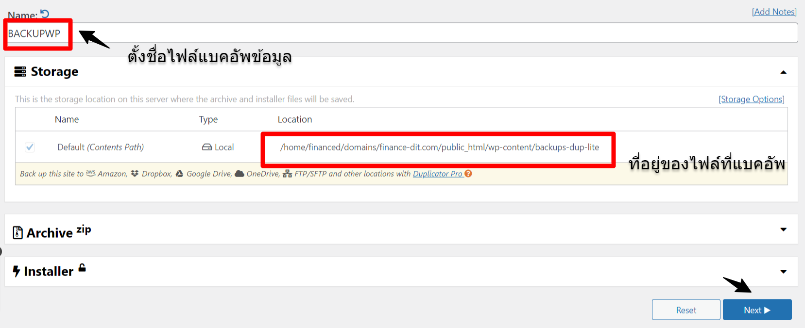 เมื่อระบบประมวลผลเสร็จ คุณจะได้รับไฟล์มา 2 ส่วนคือ Installer และ Archive แนะนำให้กดดาวน์โหลดทั้ง 2 ไฟล์นี้มาเก็บไว้ในคอมพิวเตอร์ของคุณให้เรียบร้อย ไฟล์เหล่านี้คือประกันชีวิตของเว็บไซต์ที่คุณสามารถนำไปใช้ Restore หรือย้ายโฮสติ้งได้ทันที