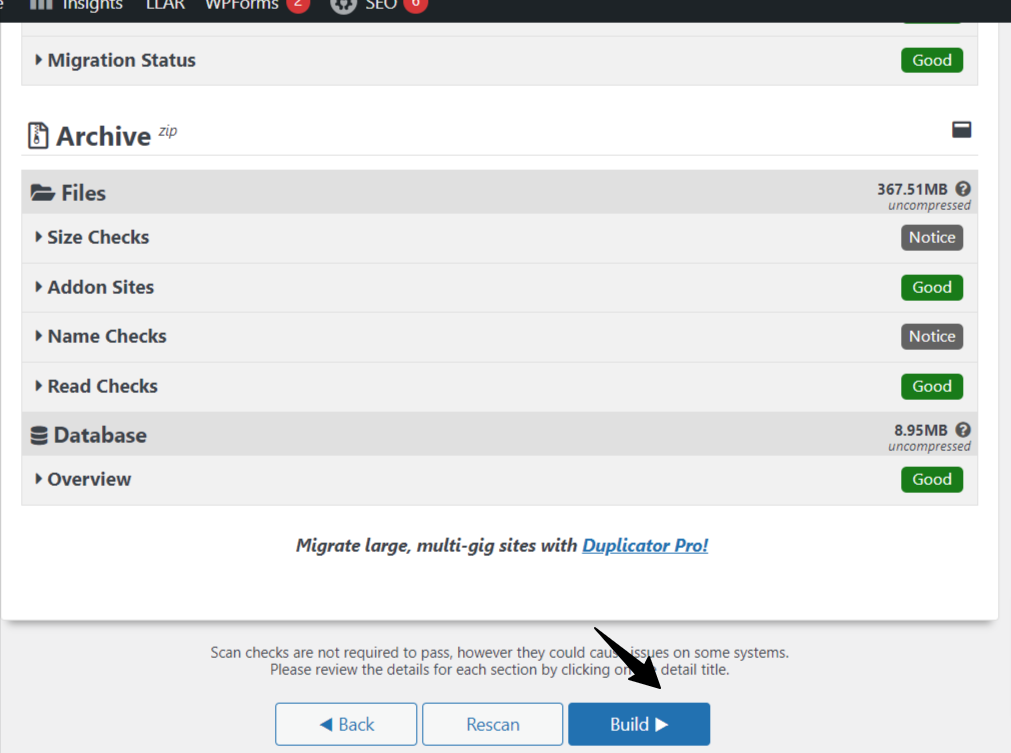 ในขั้นตอนนี้ ระบบจะทำการสแกนเว็บไซต์ของเราอย่างละเอียดเพื่อตรวจสอบความพร้อม ไม่ว่าจะเป็นขนาดไฟล์ จำนวนฐานข้อมูล และการตั้งค่าต่างๆ เมื่อการสแกนเสร็จสิ้นและทุกอย่างขึ้นสถานะสีเขียว ให้กดปุ่ม Build เพื่อเริ่มกระบวนการรวมไฟล์