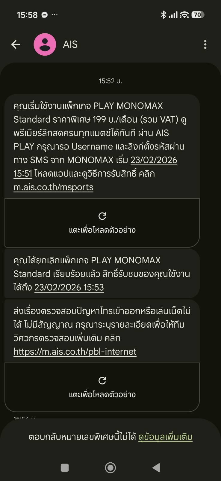 กำลังเช็คเบอร์มิจฉาชีพอยู่ในแอพ Whoscall แต่ว่ามีป๊อปอัพของ AIS ขึ้นมาแล้วไปกดใส่ ระบบมันทำการซื้อให้เองอัตโนมัติโดยไม่ตั้งใจ พอมายกเลิกในแอพมัน ก็หักเงินไปแล้ว น่าเกลียดมากๆครับที่ทำแบบนี้