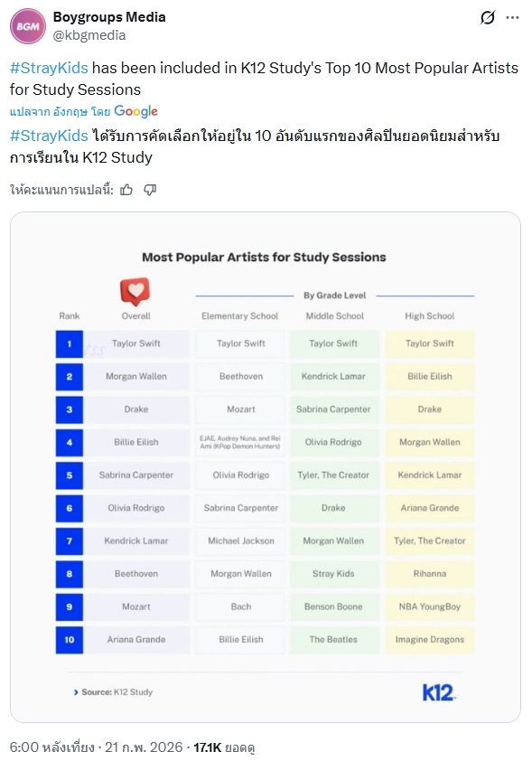 🔥 Stray Kids ได้รับการเลือกให้อยู่ใน 10 อันดับแรกของศิลปินยอดนิยมที่ถูกฟังมากที่สุดขณะเรียนหนังสือระดับมัธยมต้นใน K12