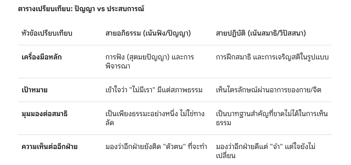 สายอภิธรรม (ปัญญาบริสุทธิ์) และ สายปฏิบัติ (จิตภาวนา) เรามาลองกางข้อมูลดูความต่างที่ทำให้สองสายนี้แทบจะคุยกันคนละภาษาครับ
