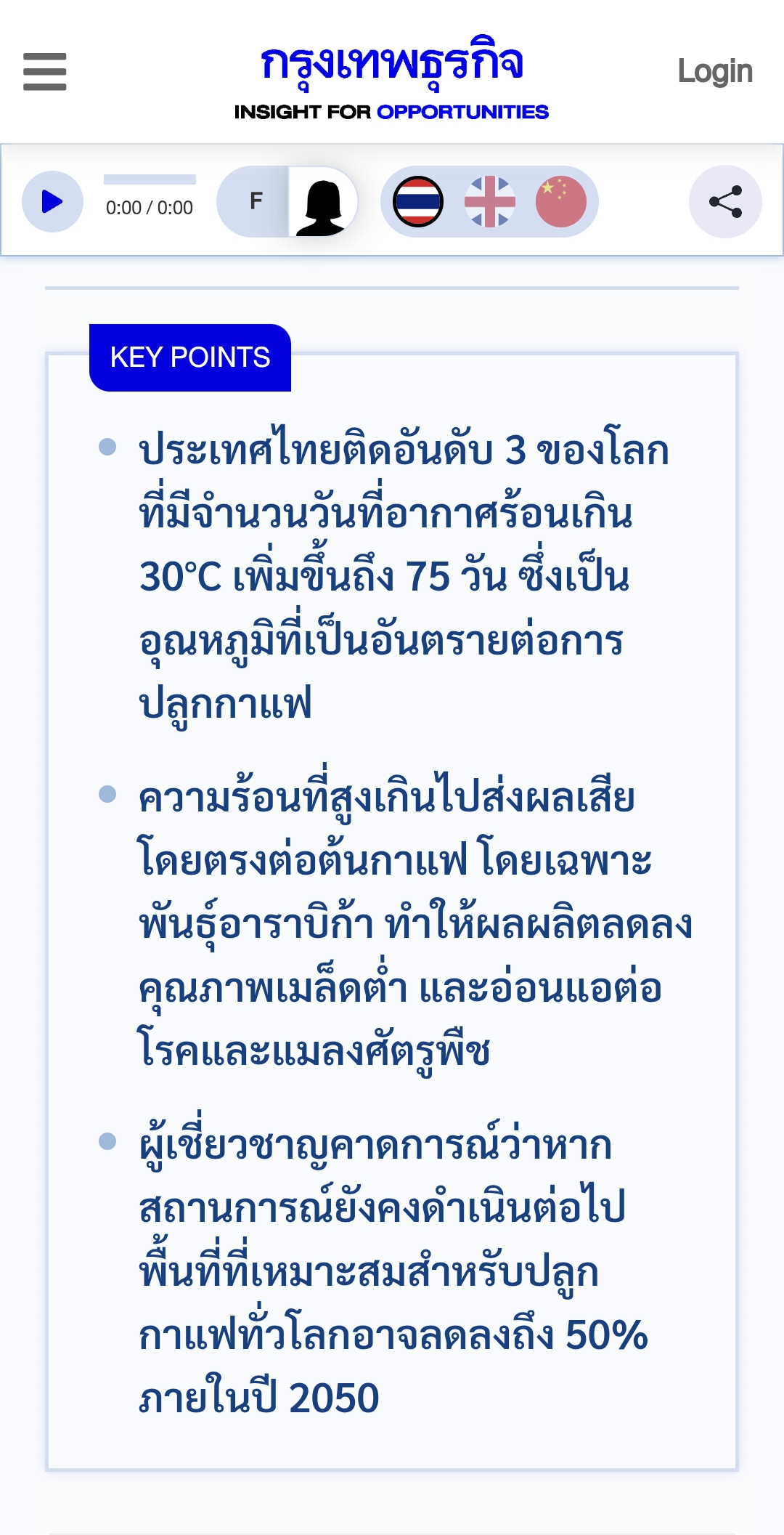 [Spoil] คลิกเพื่อดูข้อความที่ซ่อนไว้ความร้อนที่สูงเกินไปส่งผลเสียโดยตรงต่อต้นกาแฟ โดยเฉพาะพันธุ์อาราบิก้า ทำให้ผลผลิตลดลง คุณภาพเมล็ดต่ำ และอ่อนแอต่อโรคและแมลงศัตรูพืช ผู้เชี่ยวชาญคาดการณ์ว่าหากสถานการณ์ยังคงดำเนินต่อไป พื้นที่ที่เหมาะสมสำหรับปลูกกาแฟทั่วโลกอาจลดลงถึง 50% ภายในปี 2050