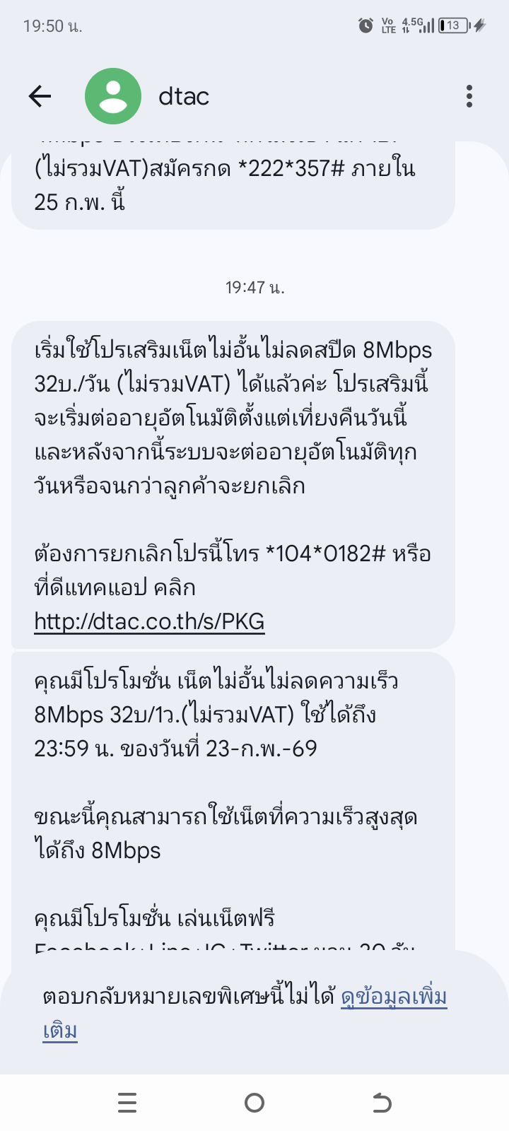 คือเราสมัครเน็ตให้แม่ โดยการเติมเงินเข้าแอปก่อนจะสมัคร แล้วเราไม่รู้ว่ามีข้อความแจ้งไปที่เครื่องแม่ว่าระบบต่อเน็ตอัตโนมัติมัติ1อาทิตย์ โทษความสำเพ้าของตัวเองด้วยแหละที่ไม่ได้อ่านในรายการแพ็กเกจที่ใช้อ