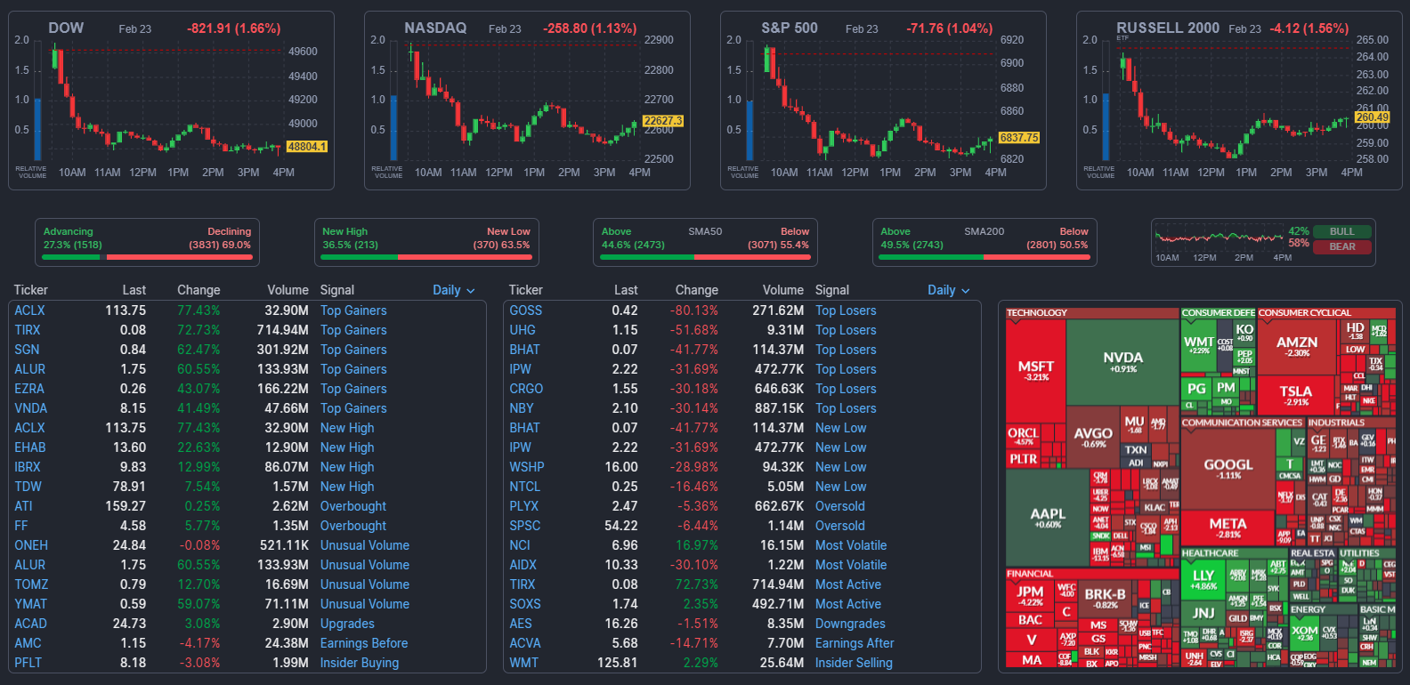 ตลาดหุ้นสหรัฐปิดการซื้อขายวันจันทร์ปรับตัวลดลงอย่างรุนแรง ท่ามกลางแรงเทขายในวงกว้าง หลังนักลงทุนกังวลต่อผลกระทบของเทคโนโลยีปัญญาประดิษฐ์ (AI) ที่อาจสร้างความปั่นป่วนต่อภาคธุรกิจ ควบคู่กับความไม่แน่นอนด้านนโยบายการค้าของประธานาธิบดีโดนัลด์ ทรัมป์