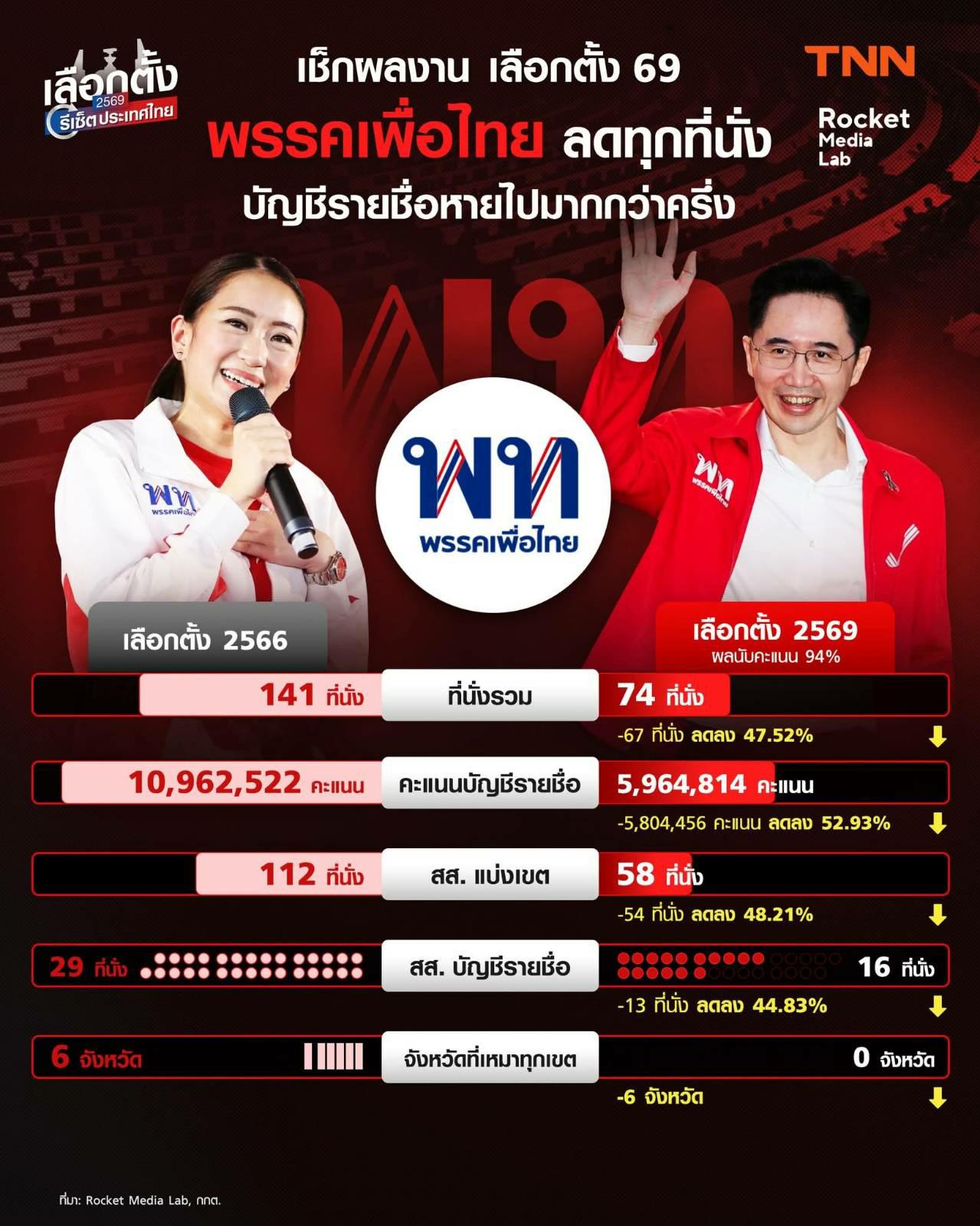 เช็กผลงาน เลือกตั้ง 69 พรรคเพื่อไทยลดทุกที่นั่ง บัญชีรายชื่อหายไปมากกว่าครึ่ง